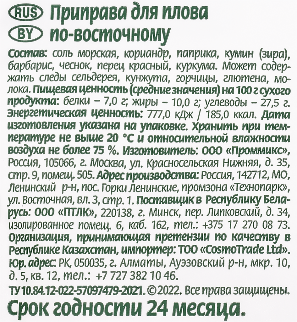 | Состав | кориандр; соль морская; паприка; кумин; барбарис; чеснок; перец красный; куркума |