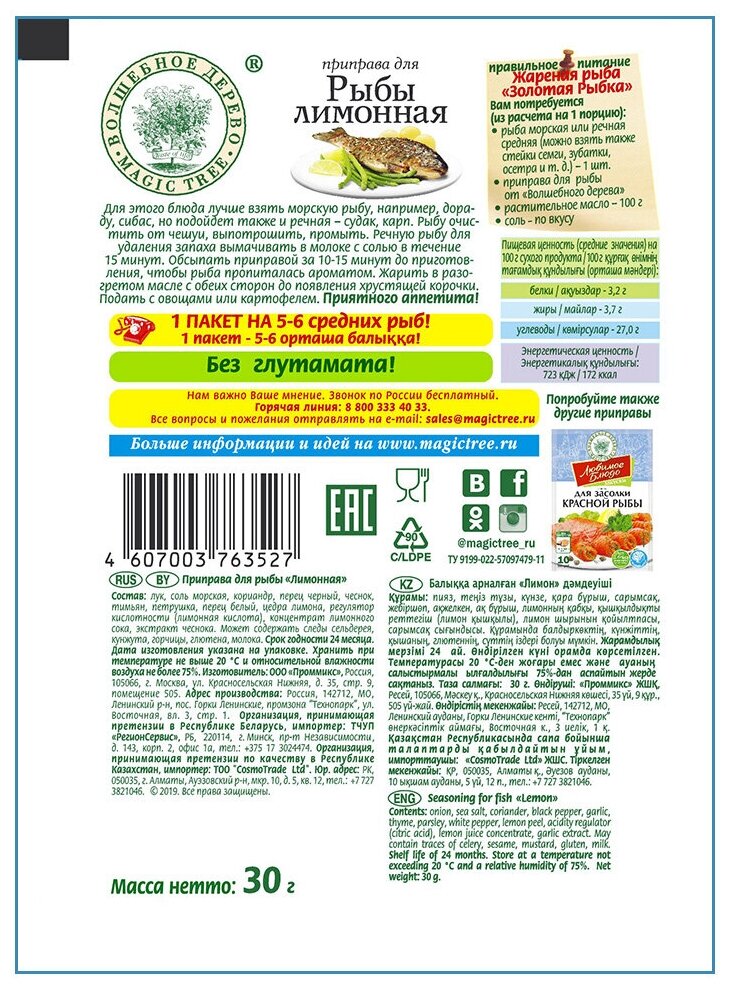 | Состав | Лук, соль морская, кориандр, перец черный, чеснок, тимьян, петрушка, перец белый, регулятор кислотности (лимонная кислота), цедра лимона, концентрат лимонного сока, экстракт чеснока. |