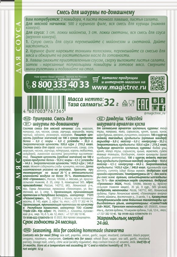 Смесь для приготовления домашней шаурмы – это простое и вкусное сочетание специй и трав, облегчающий создание любимого блюда в домашних условиях. Для домашней шаурмы бренд «Волшебное Дерево» предлагает готовую смесь пряностей, специй и уникальный рецепт приготовления. Смесь состоит из 2 частей - микса для мяса и для соуса, придающих Вашей шаурме насыщенный вкус и чарующую ароматность.