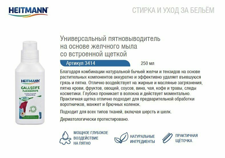 Специально разработанный пятновыводитель Heitmann Со встроенной щеткой перед стиркой 250 мл идеально подходит для обработки воротничков и манжет перед стиркой. Благодаря содержанию желчного мыла действует моментально, проникая глубоко в волокна ткани и очищает их от грязи и пятен. Подходит для любого моющегося и чувствительного текстиля.
