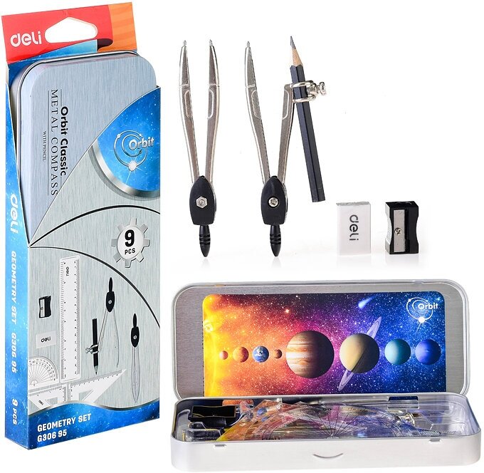 | Комплектация | циркуль/карандаш/кронциркуль/линейка 15см/2 треугольника/транспортир/ластик/точилка |