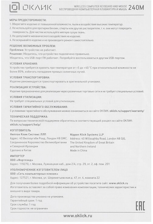 На сегодняшний день товар «Комплект (клавиатура+мышь) OKLICK 240M USB беспроводной белый» можно купить с кешбеком в 1 магазине: Яндекс.Маркет