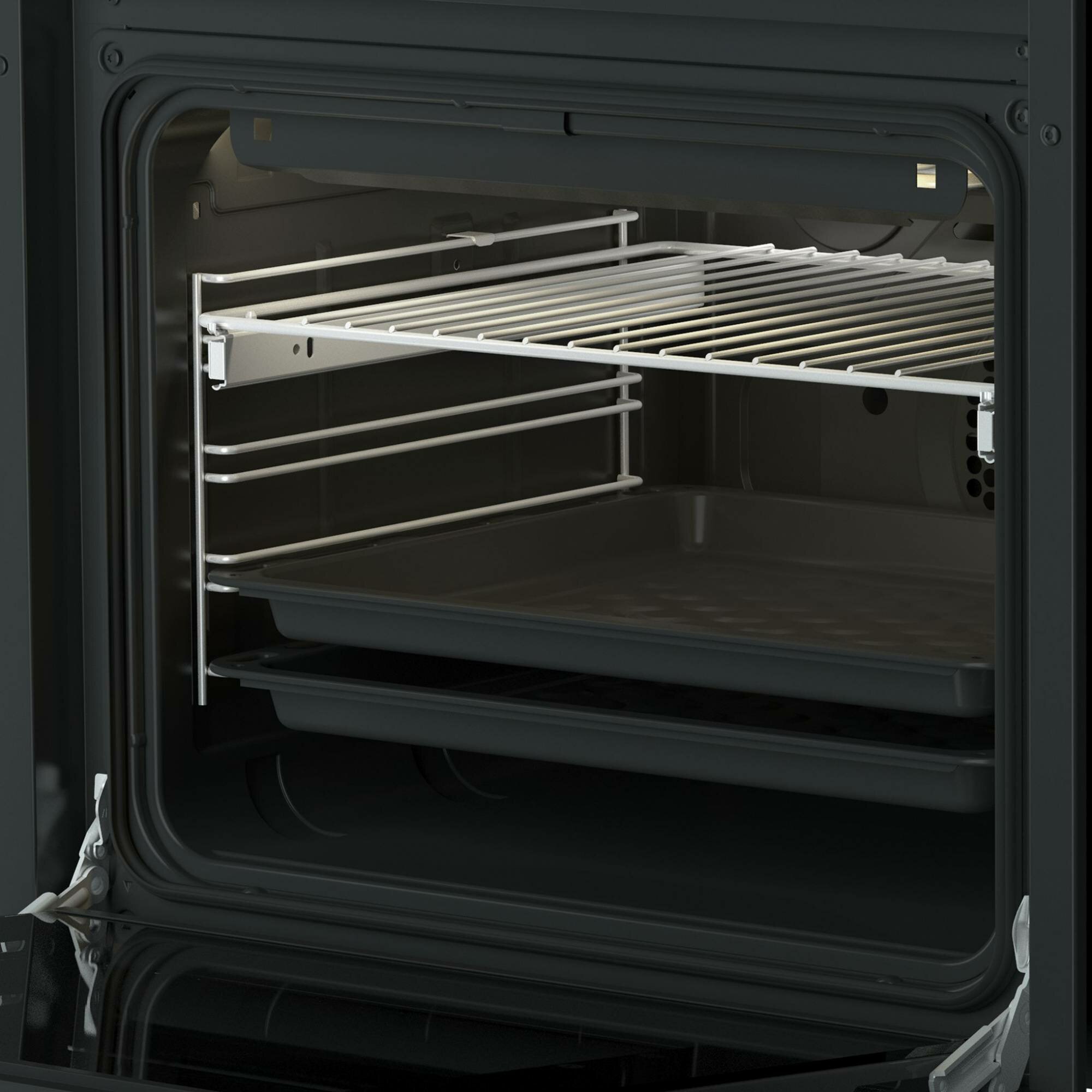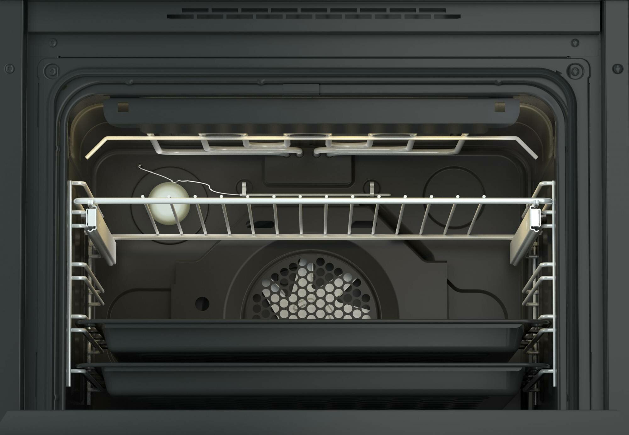 | Особенности конструкции | вентилятор охлаждения, полностью стеклянная внутренняя поверхность дверцы духовки, телескопические направляющие |