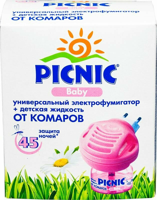Прибор + жидкость Picnic Baby от комаров - незаменимое средство для защиты малышей от кровососущих насекомых в помещении. В составе действующего вещества (репеллента) – натуральный экстаркт далматской ромашки, известный своей эффективностью против насекомых. Средство не имеет запаха и абсолютно безопасно для взрослых, детей, а также домашних животных. Жидкость Picnic Baby обеспечивает надежную и длительную защиту от комаров в помещении на протяжении 45 ночей.Особенности:Не имеет запаха.Универсальный прибор подходит как для жидкости, так и для пластин.Имеет световой индикатор и поворотную вилку.Средство начинает действовать через 10-15 минут после включения.Полное уничтожение комаров достигается через 1-2 часа.Гарантия пожаро- и электробезопасности.Действие жидкости - 45 ночей.Объем флакона: 30 мл.