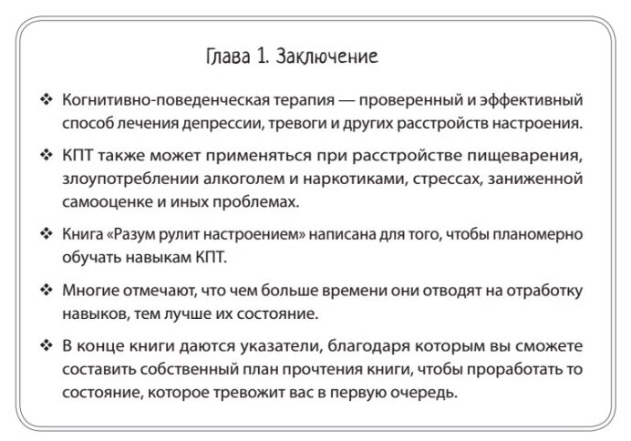 Книга написана простым языком без излишней терминологии, что уже плюс. Она содержит не размышления на тему, а реально работающие методы КПТ. Эта книга не волшебная таблетка (выпей что-то или скушай что-то и через неделю жизнь как в сказке), придется поработать над собой и набраться терпения. Подход КПТ пробивал на себе и могу однозначно сказать – работает.
