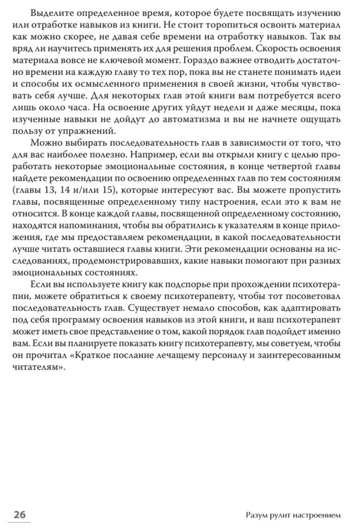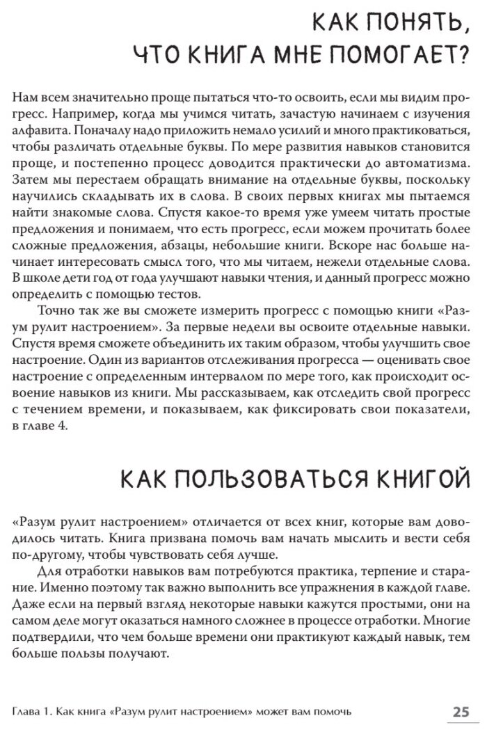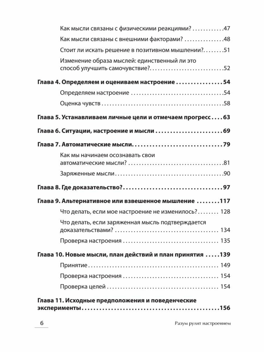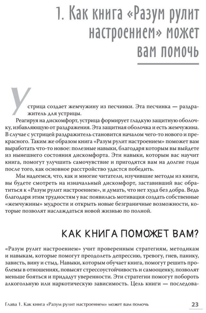 В книге подробно про – мысли, настроение, физические реакции, поведения. Как работать с депрессией, тревогой, виной, стыдом, гневом. Кстати, авторы подсказывают, в какой последовательности можно читать книгу, если вам нужно проработать в первую очередь,например, гнев.