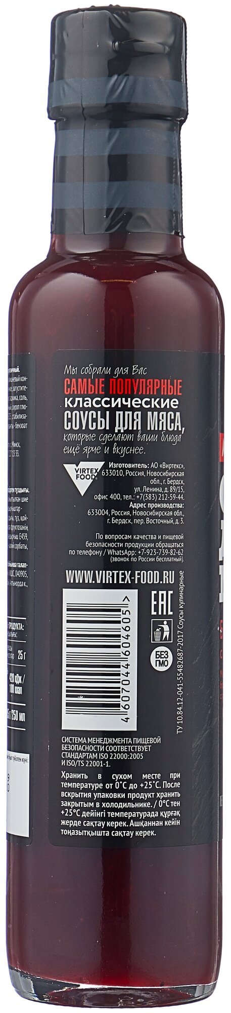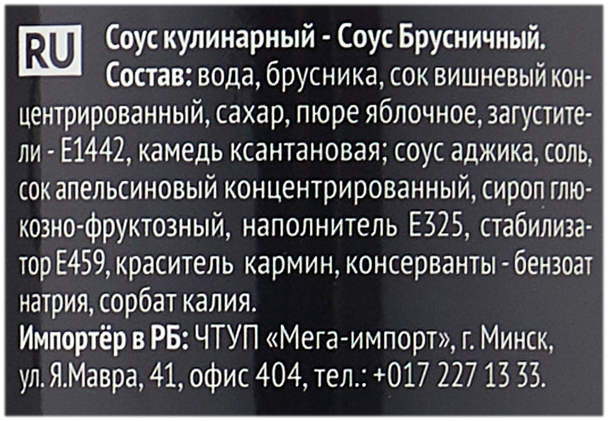 | Состав | вода, брусника, сок вишневый концентрированный, сахар, пюре яблочное, загуститель - Е1442, камедь ксантановая; соус аджика, соль, сок апельсиновый концентрированный, сироп глюкозно-фруктозный, наполнитель Е325, стабилизатор Е459, краситель кармин, консерванты - бензоат натрия, сорбат калия |