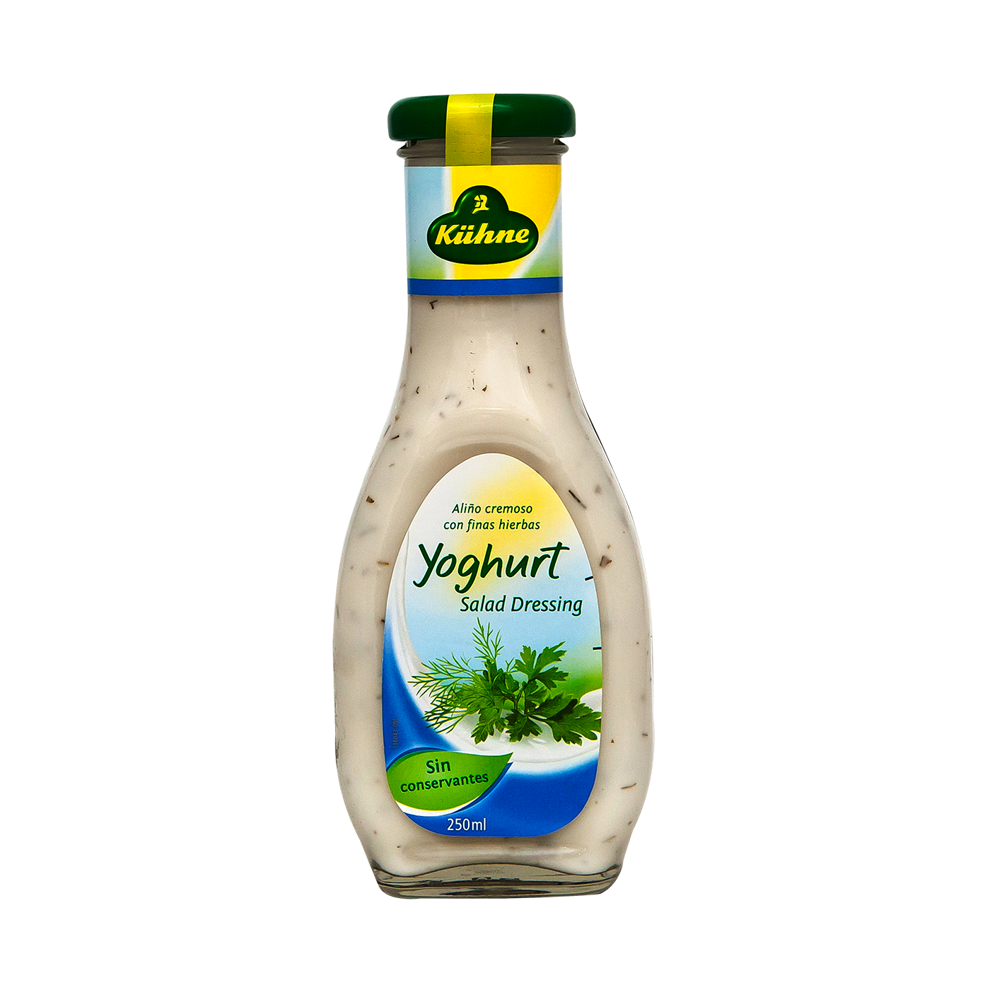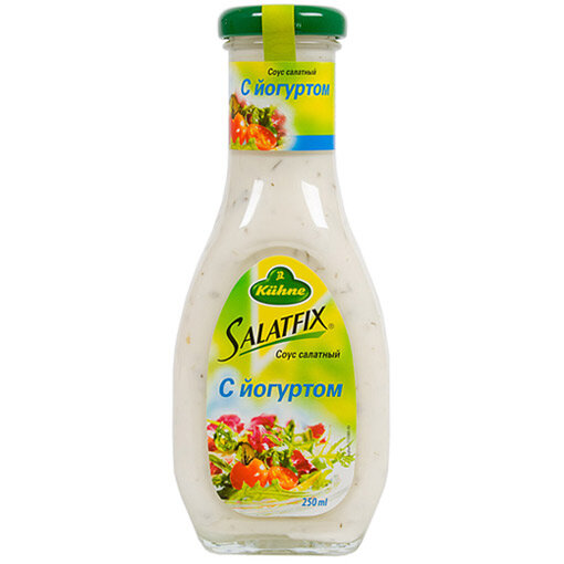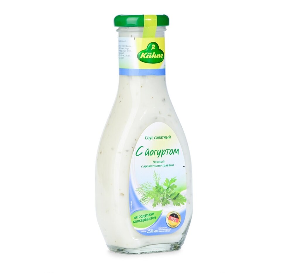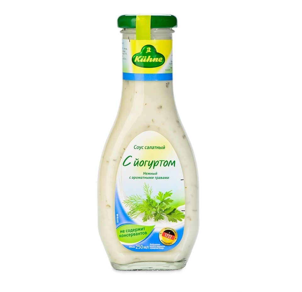 Соус салатный Kuhne приготовлен на основе натурального йогурта. Продукт отличается нежным сладко-кислым вкусом и неповторимым сливочным ароматом с нотками пряностей. Продукт прекрасно подходит для заправки салатов и приготовления маринадов для шашлыка.