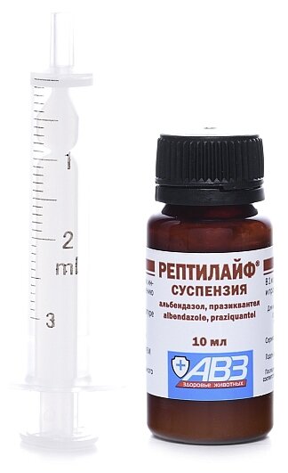 Рептилайф суспензия в качестве действующих веществ в 1 мл содержит альбендазол – 25 мг и празиквантел – 10 мг, а также вспомогательные вещества.