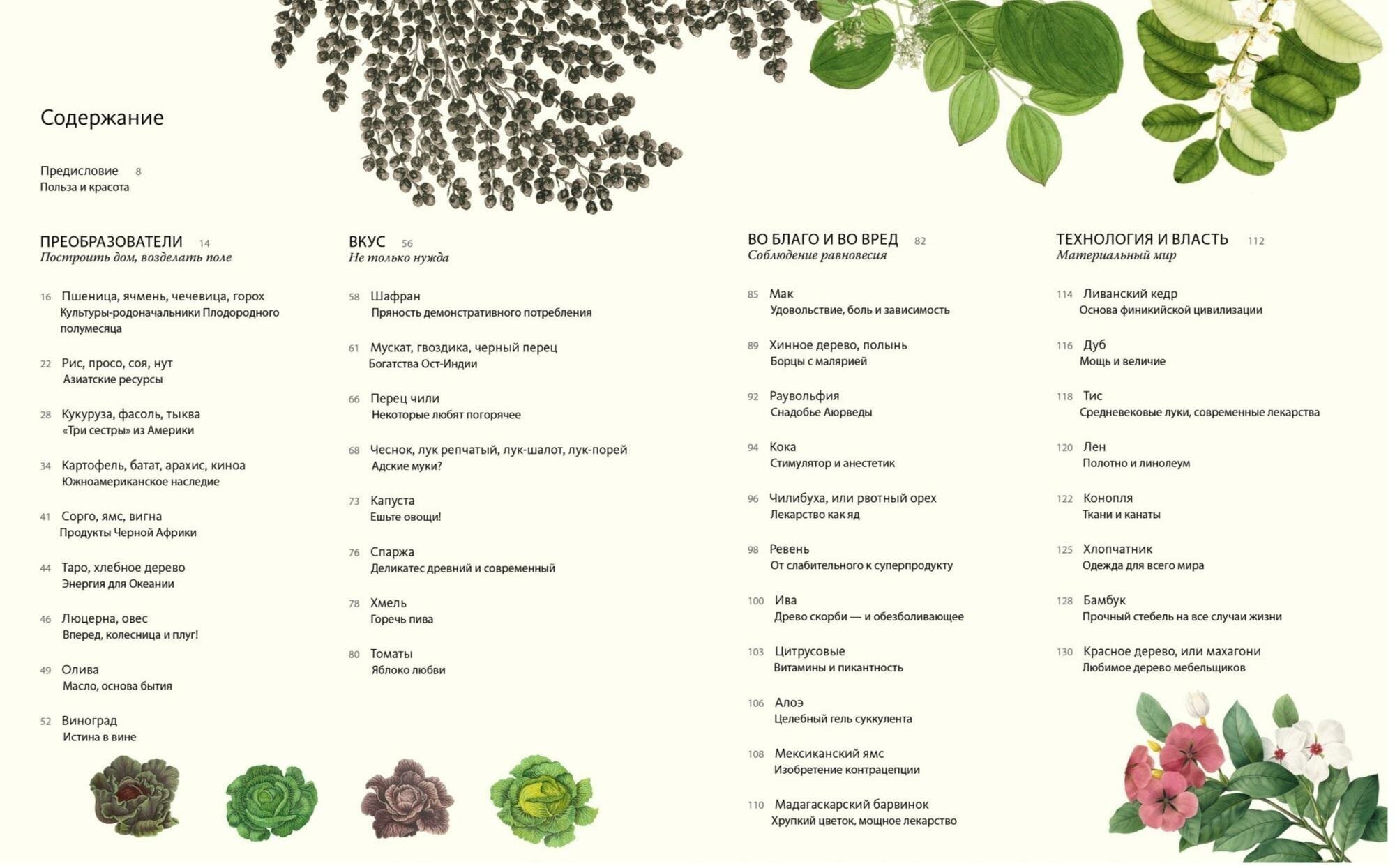 Книга поделена на главы, каждая из которых рассказывает о том. как растения влияют на нашу жизнь,культуру, историю, материальный мир.