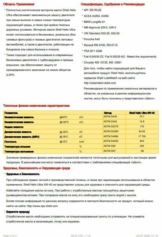 | Спецификации OEM | BMW LL-01, MB 229.5, 226.5, VW 502.00/505.00, Porsche A40, Renault RN0700, RN0710, PSA B71 2296, Ferrari, Fiat 9.55535-Z2, Chrysler MS-10725 |