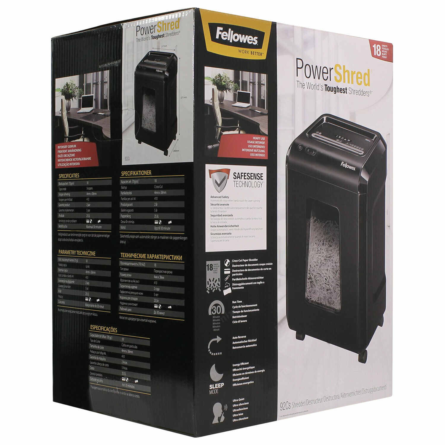 | Прочие особенности и свойства | Powershred®92Cs – высокопроизводительный офисный уничтожитель бумаг в компактном корпусе. Новинка отличается высокой продуктивностью измельчения - 18 листов и действительно долгим рабочим циклом – 30 минут непрерывной работы без остановки. Рекомендуемое количество уничтожаемых бумажных документов в день – до 1000 листов. Шредер 92Cs относится к P-4 уровню секретности по DIN 66399. Документы разрезаются на фрагменты размером 4x38мм, при этом 1 лист бумаги формата А4 будет измельчаться на 400+ фрагментов. Уничтожитель обеспечит надёжное и безвозвратное уничтожение для большинства офисных бумаг, которые могут быть скреплены канцелярскими скрепками или скобами для степлера. Кроме бумажных носителей шредер способен уничтожить пластиковые карты и CD, DVD диски. Уничтожитель Fellowes 92Сs оснащается удобной выдвижной корзиной 25 л, что примерно соответствует 250 листам А4. Наполняемость корзины легко контролируется при помощи большого окна. Шредер оборудуется колесами для быстрого и легкого перемещения по офису. Шредер Fellowes 92Cs удобен и прост в использовании благодаря дополнительным индикаторам бумажного затора, изъятой и наполненной корзины. Предусмотрена автоматическая защита от перегрева и автоотключение при извлеченной корзине. |
