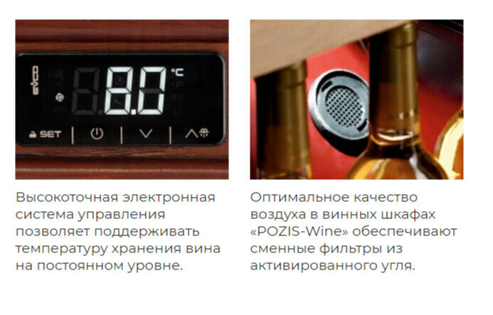 Винный шкаф Pozis ШВ-120 – автоматическое поддержание температуры в камере! Оптимальное качество воздуха в винном шкафу обеспечивает сменный фильтр из активированного угля. Высокоточная электронная система управления позволяет поддерживать температуру хранения вина на постоянном уровне. Выдвижная наклонная полка из ценных пород дерева поддерживает в холодильной камере шлейф благородного аромата и идеально подходит для демонстрации коллекции вин.