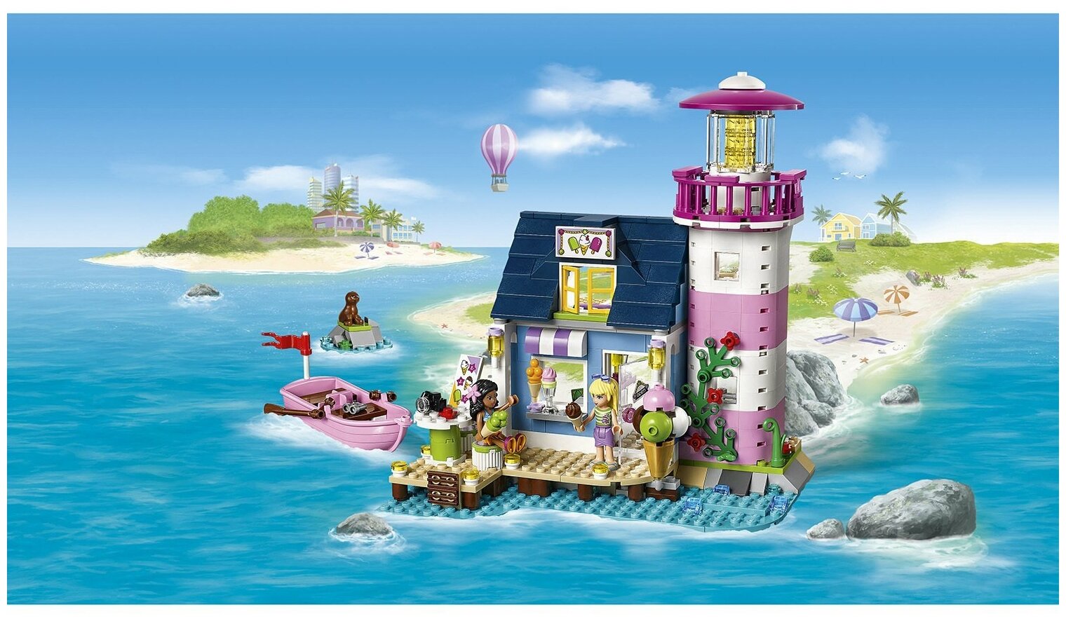 Набор LEGO Friends - отличный повод приобщиться к увлекательному процессу конструирования. С помощью деталей набора ребенок самостоятельно создает персонажей для множества интересных игр с различными сюжетами, давая абсолютную свободу фантазии и воображению. Проведи восхитительный день у моря на знаменитом маяке Хартлейк Сити! Стефани встречается со своей подругой Кейт в кафе. Помоги ей выбрать самое вкусное мороженое и насладись им на солнечном причале. Отправляйся в ванную, чтобы освежиться. Любопытно, куда же ведет эта лестница? Сходи на разведку вместе со Стефани и найди тайную комнату с картой сокровищ! С вершины маяка открывается потрясающий вид. Возьми бинокль, чтобы разглядеть милейшего морского котика, который греется на скале. Скорее прыгай в шлюпку и отправляйся фотографировать его. Удивительный день полон интересных приключений! Вечером включи фонарь и отдохни вместе с Кейт в комнате в мансарде. Набор совместим с другими конструкторами серии LEGO Friends.