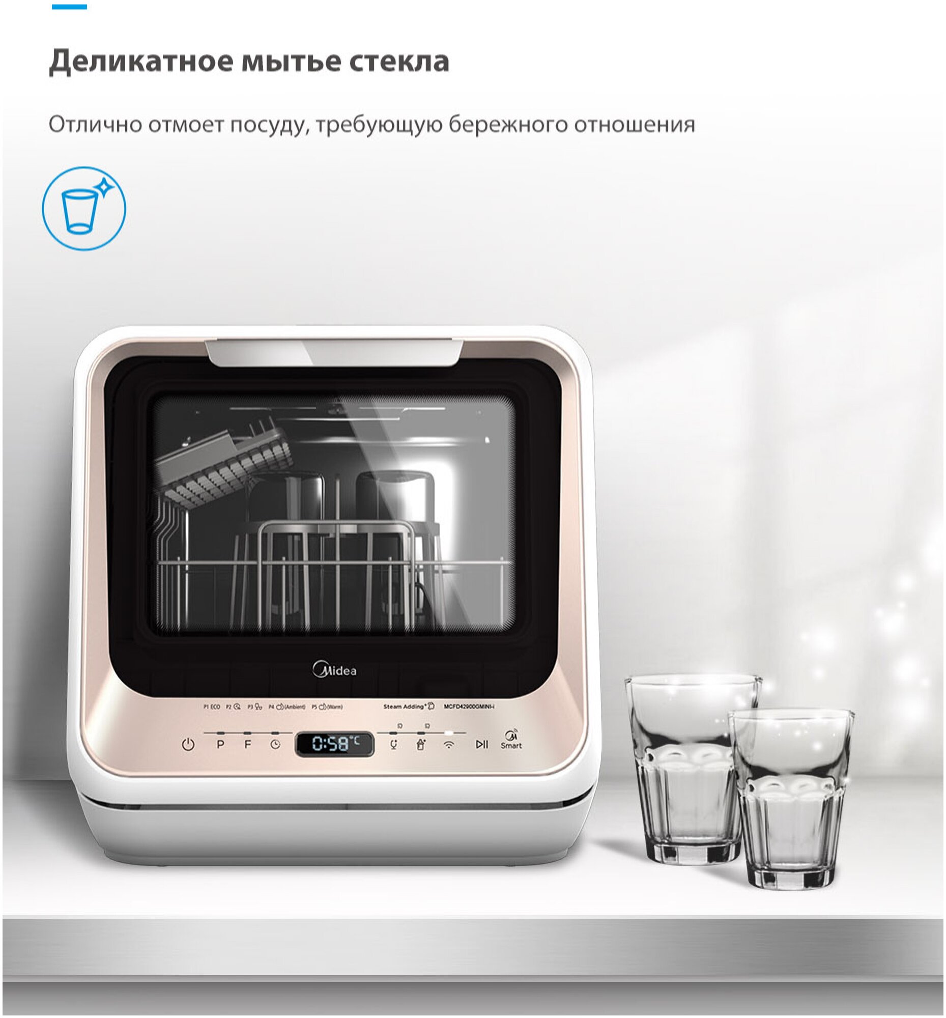 Компактная настольная посудомоечная машина Midea MCFD-42900 Mini шириной 42 см. Благодаря низкому уровню энергопотребления посудомоечной машине присвоен класс энергоэффективности А. Также качеству мойки и сушки присвоен класс А. Уровень шума во время работы не превышает 58 дБ. Вместимость посудомоечной машины позволяет загружать одновременно до 2 комплектов посуды. За стандартный цикл работы расходуется 5 литров воды. Midea MCFD-42900 Mini оснащена электронным блоком управления и цифровым дисплеем. Функционал модели дополнен 6 различными программами мытья посуды и 4 температурными режимами. Среди программ есть интенсивный режим, экспресс-цикл. Также предусмотрена специальная программа для мытья хрупкой посуды, детский режим. Предусмотрена турбосушка посуды. Таймер откладывает начало работы до 24 часов. Система индикации сообщает о наличии ополаскивателя. Моечная камера подсвечивается изнутри.