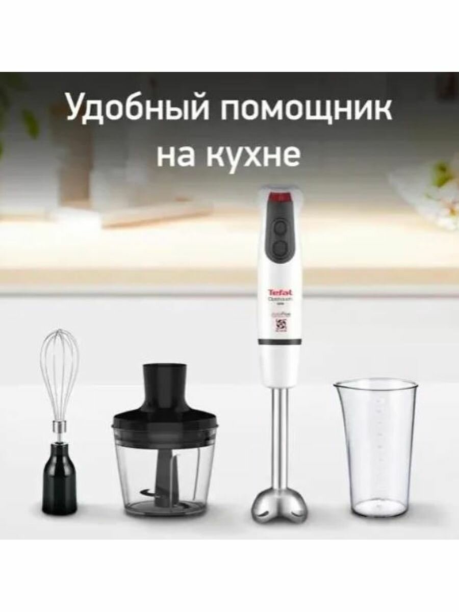 Блендер Tefal оснащён мощным 600-ваттным мотором, благодаря которому он справляется с переработкой продуктов за считаные минуты. Прибор сэкономит ваше время и силы и позволит приготовить множество разнообразных блюд.насадки В комплектеПогружная «нога» пригодится для пюре и детского питания. Острые ножи, выполненные из нержавеющей стали, обеспечат однородную текстуру без комочков. Венчик взобьёт яичные белки, кремы, муссы, соусы и молочные коктейли. А в большом измельчителе объёмом 500 мл вы сможете сделать, например, овощные заготовки для суповой заправки, фарш для тефтелей, мясо для макарон по-флотски. Мерный стакан (800 мл) поможет точно следовать рецепту. гибкая настройкаК вашим услугам 16 скоростей, причём наращивать или снижать обороты можно прямо в процессе работы устройства. Кнопки управления удобно расположены на рукоятке, так что прерывать процесс не понадобится, вы легко справитесь одной рукой. Есть и режим «Турбо», который переработает самые твёрдые ингредиенты.