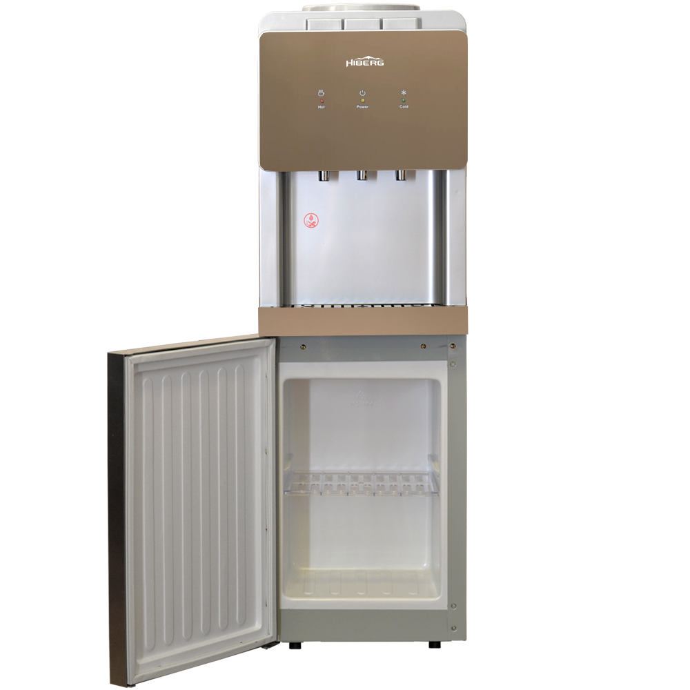 Кулер-диспенсер Hiberg — оптимальное решение и для небольшого офиса, и для дома. За бесперебойную подачу чистой жидкости отвечают три крана с механическим управлением. Индикаторы светового типа проинформируют пользователя о нагреве воды, а также о подключении модели к сети электропитания. Бутыль объемом 19 л устанавливается на верхнюю панель горлышком вниз. Кулер-диспенсер Hiberg оборудован встроенным отделением объемом 14 л, полки внутри позволят разместить не только чайные и кофейные принадлежности, но также стаканы и бокалы. Производительное устройство способно охлаждать воду со скоростью 2 л/час до температуры в диапазоне от +10 до +15°С. Бак для горячей воды, максимальный уровень нагрева которой составляет 95°С, изготовлен из прочной стали, не подверженной коррозии. Модель подсоединяется к электрической сети со стандартным уровнем напряжения 220 В.
