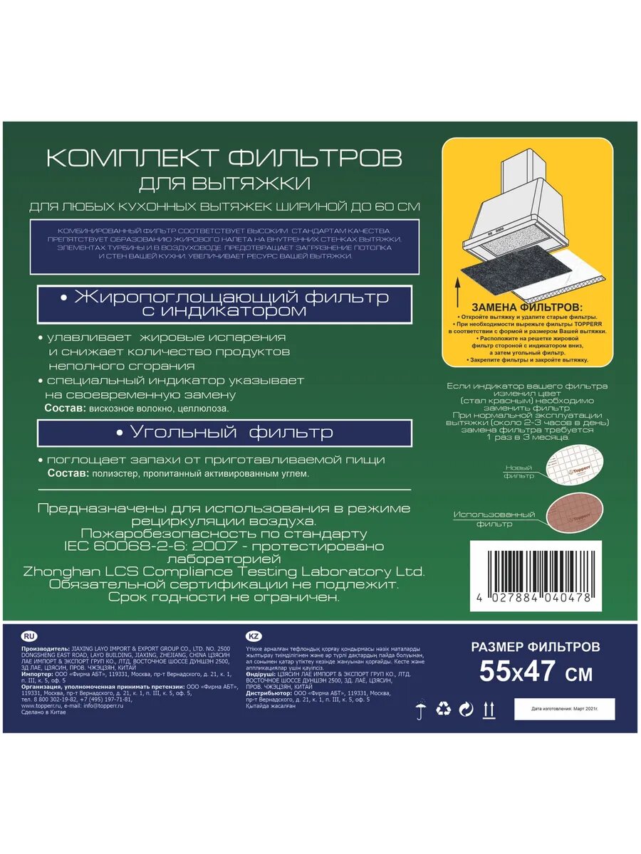 -жиропоглощающий фильтр размером 47 см*55 см с индикатором Topperr, как только индикатор изменит свой цвет с серого на красный – произведите замену фильтра.