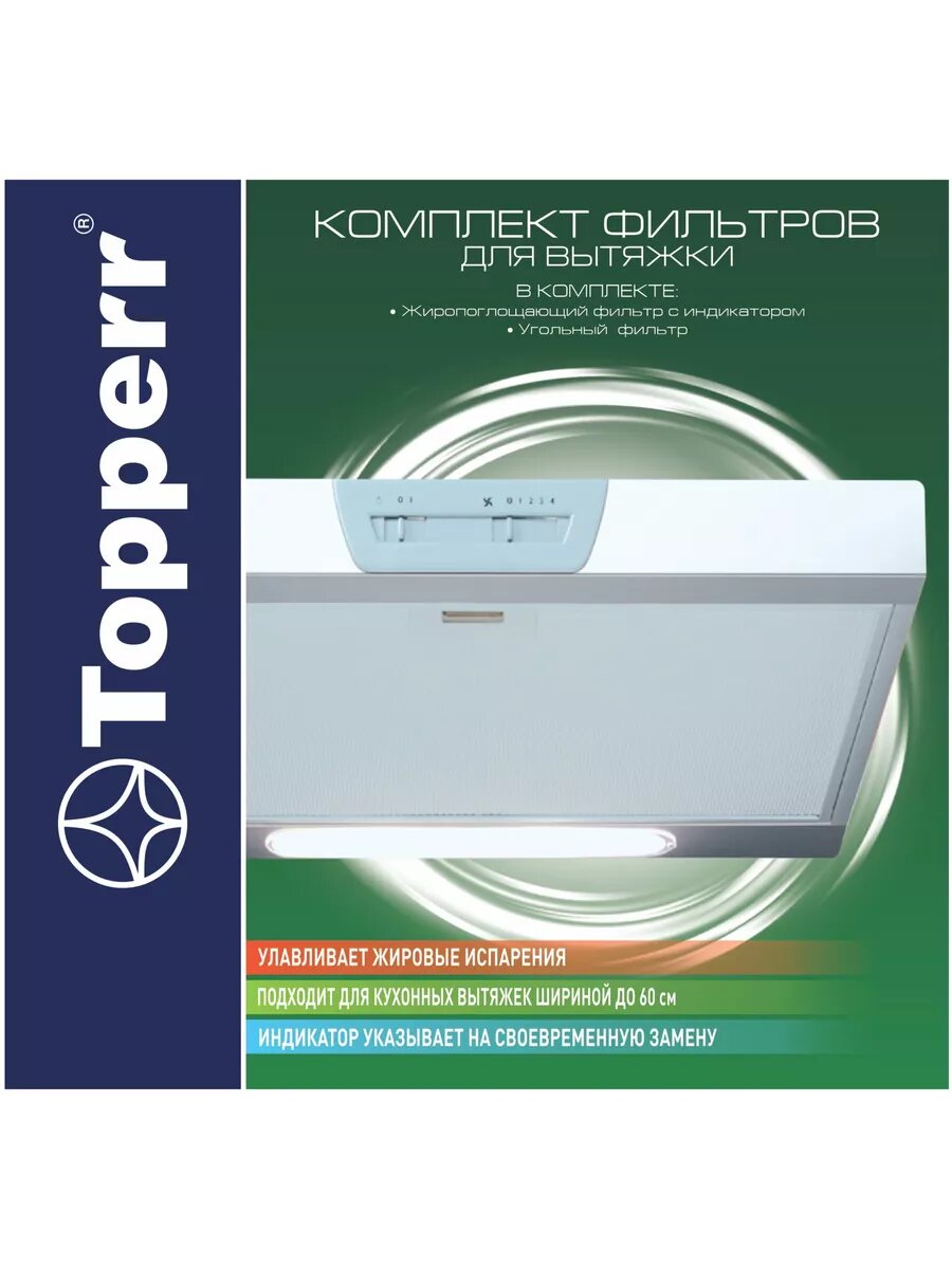 Комплект фильтров Topperr 1112 подходит к любым кухонным вытяжкам шириной 50-60 см, удаляет запахи. В наборе 2 предмета: угольный фильтр размером 47x55 см и жиропоглощающий фильтр размером 47x55 см с индикатором Topperr.