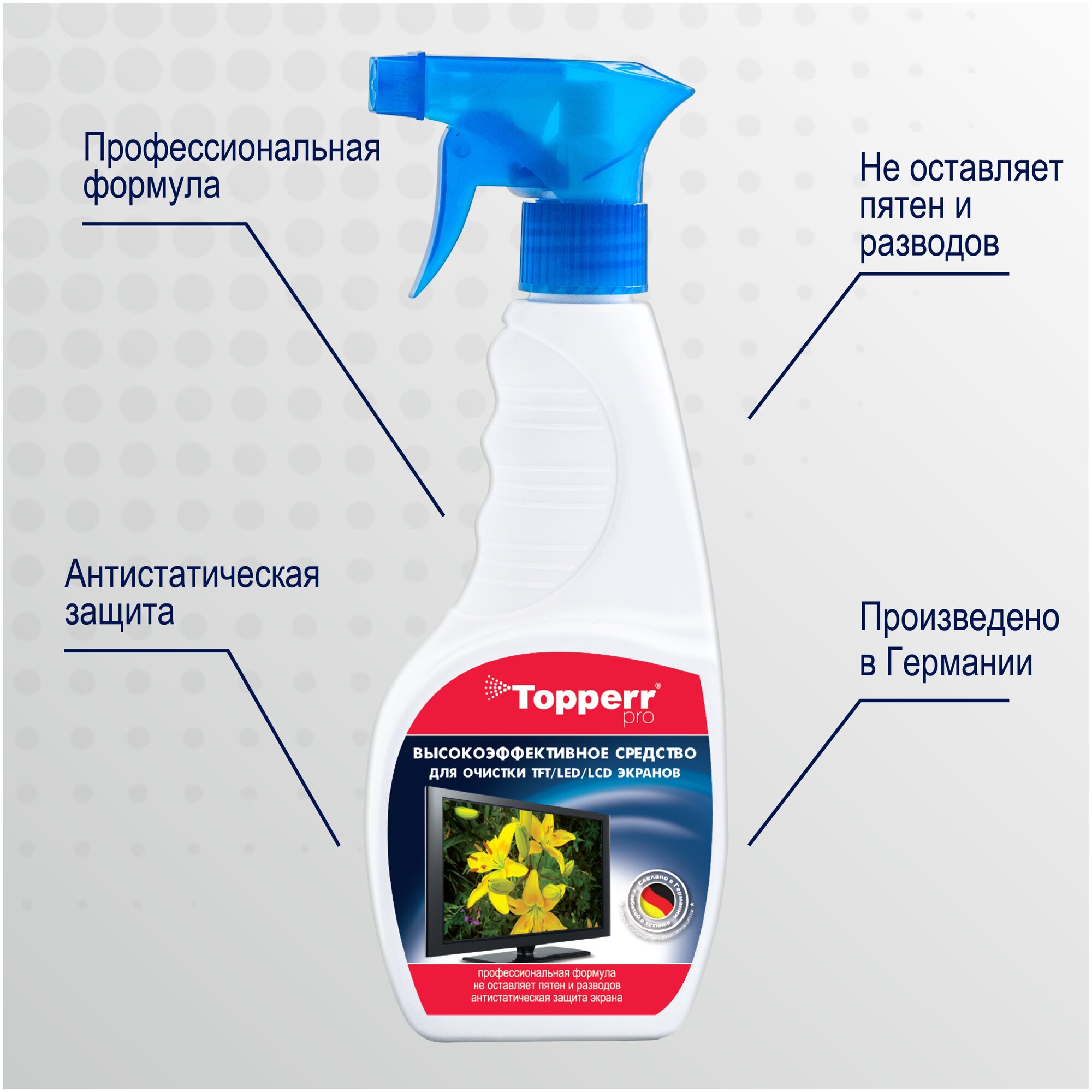 Чистящее средство Topperr – прекрасное решение для очистки экрана телевизора или монитора. С Topperr ваш экран будет выглядеть превосходно. А самое приятное, что на поверхности не останется пятен и разводов. Благодаря отличному объему в 500 мл средства хватит на долгое время.