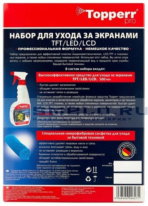 | Состав набора | средство для ухода за tft/ led/lcd мониторами, специальная салфетка из микрофибры |