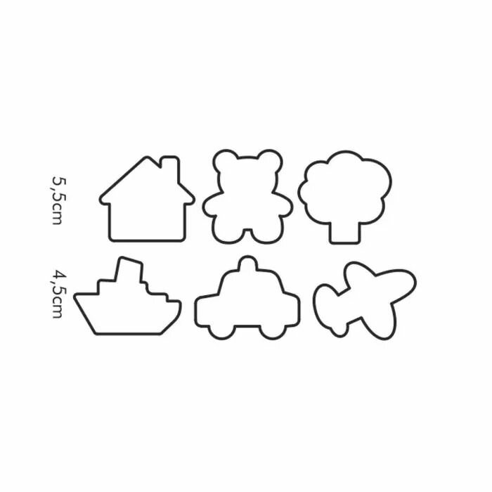 Формочки для печенья Tescoma "Delicia Kids" изготовлены из пластика. Предназначены для вырезания печенья. Можно использовать как трафареты для поделок и с непищевыми материалами. С такими формами- резаками можно сделать множество интересных фигурок и поделок. Можно мыть в посудомоечной машине.Средний размер формы: 6,5 х 5 см.Высота стенки формы: 2 см.
