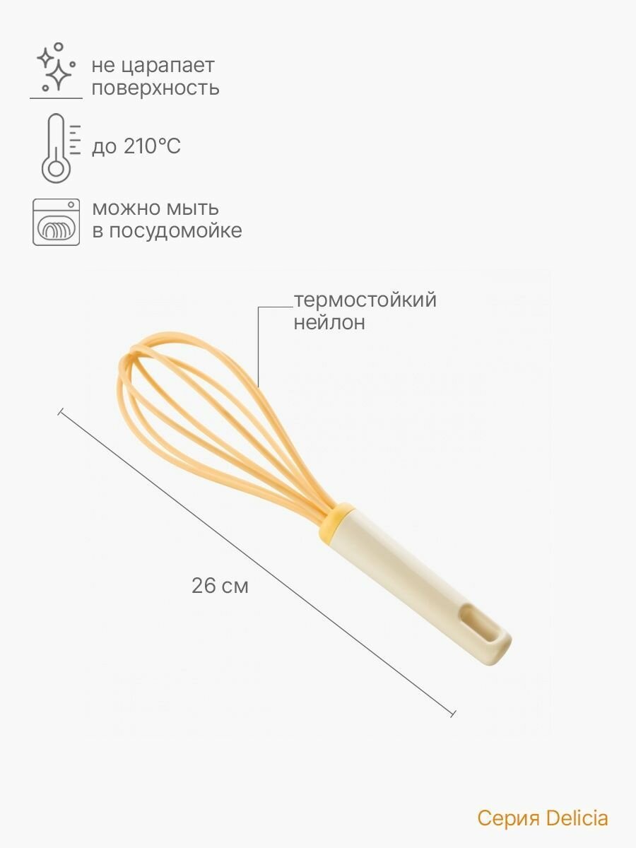 Венчик из термостойкого нейлона (210 С) отлично подходит для взбивания продуктов в емкостях из нержавеющей стали и пластика, а также в посуде с антипригарным покрытием, так как не царапает и не повреждает поверхности.