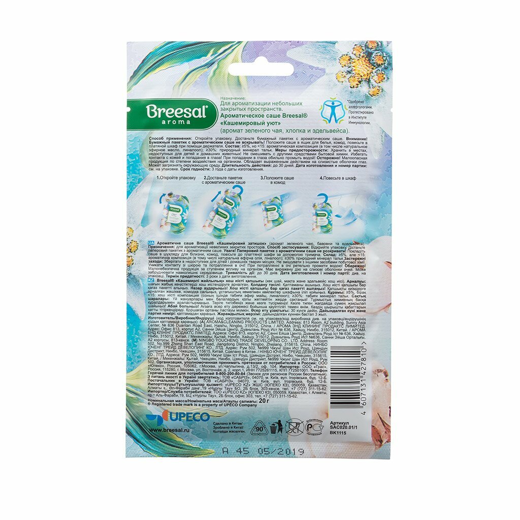 На сегодняшний день товар «Ароматическое саше для белья Breesal Comfort, Кашемировый уют (SAC020.01/1)» можно купить с кешбеком в 1 магазине: Яндекс.Маркет
