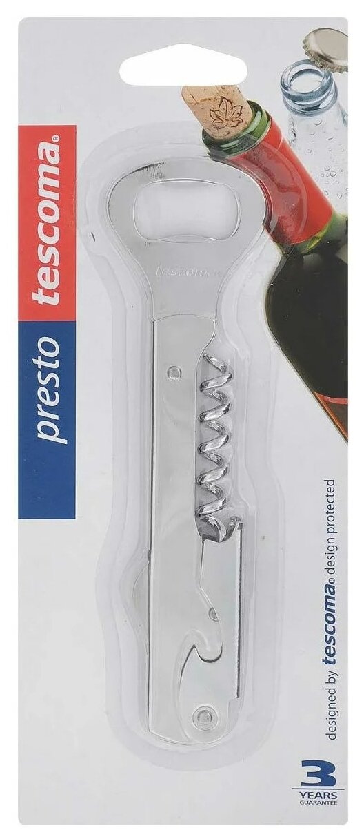 Открывашка-штопор Tescoma Presto – это удобный и очень простой в использовании инструмент для открывания бутылок. Рабочая часть и ручка выполнена из прочной и долговечной нержавеющей стали. Подходит для использования на домашней и профессиональной кухнях.