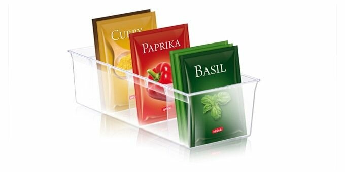 Держатель для наглядного хранения пакетов со специями всех стандартных размеров. Снабжен тремя регулируемыми отделениями, подходит для кухонных ящиков всех стандартных размеров. Изготовлен из прочной пластмассы, можно мыть в посудомоечной машине.