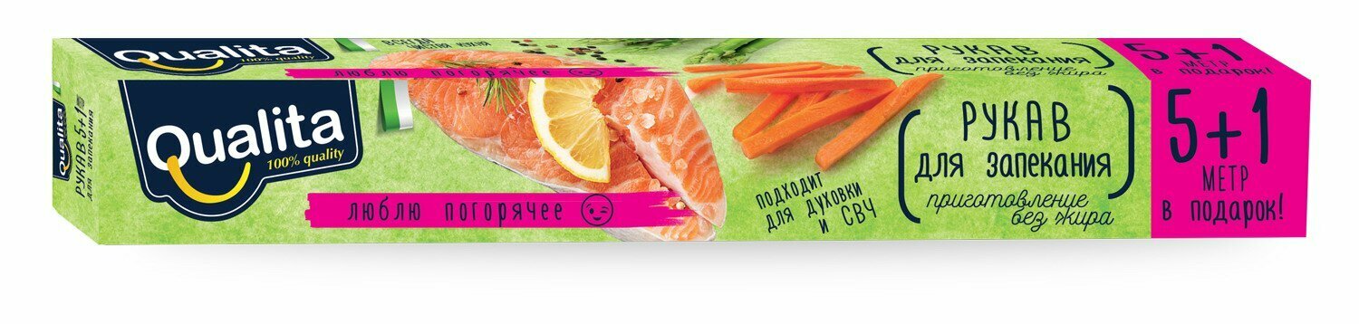 При запекании в рукаве продукт натуральный вкус, аромат, витамины и макроэлементы. За счет циркуляции горячего воздуха запекание происходит равномерно и блюда получаются сочными и низкокалорийными. Не требует добавления масла. Подходит как для духовки, так и для СВЧ. Благодаря наличию клипс рукав прост в использовании, легко открывается и закрывается. Длина рукава 3+1м, ширина рукава 30 см. Qualita – это идеальное решение для людей, которые ценят свое время. Продукция Qualita облегчит хозяйкам уход за домом и поможет приготовить самые вкусные и полезные блюда.