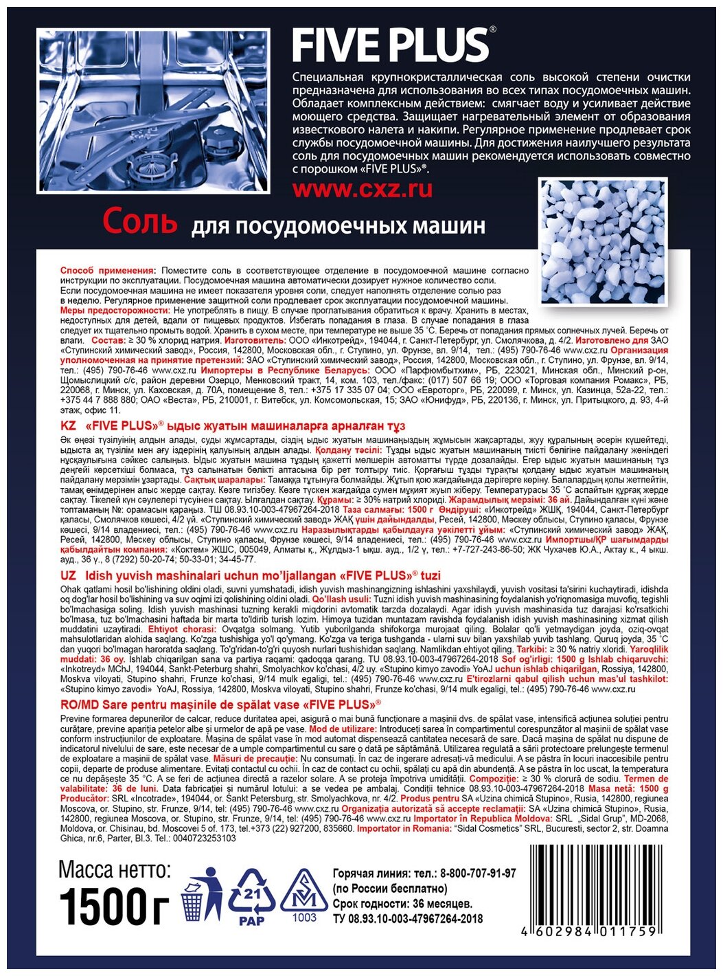 Cоль для посудомоечных машин Five Plus 1,5 кг (9628)