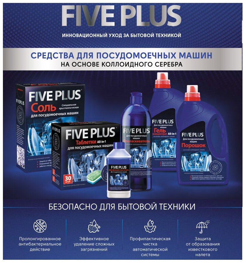 Специальная соль для посудомоечной машины 5 плюс смягчает воду, предотвращая образование известкового налета на разбрызгивателях и сливной трубе, тем самым соль для посудомойки продлевает срок службы Вашей посудомоечной машины.