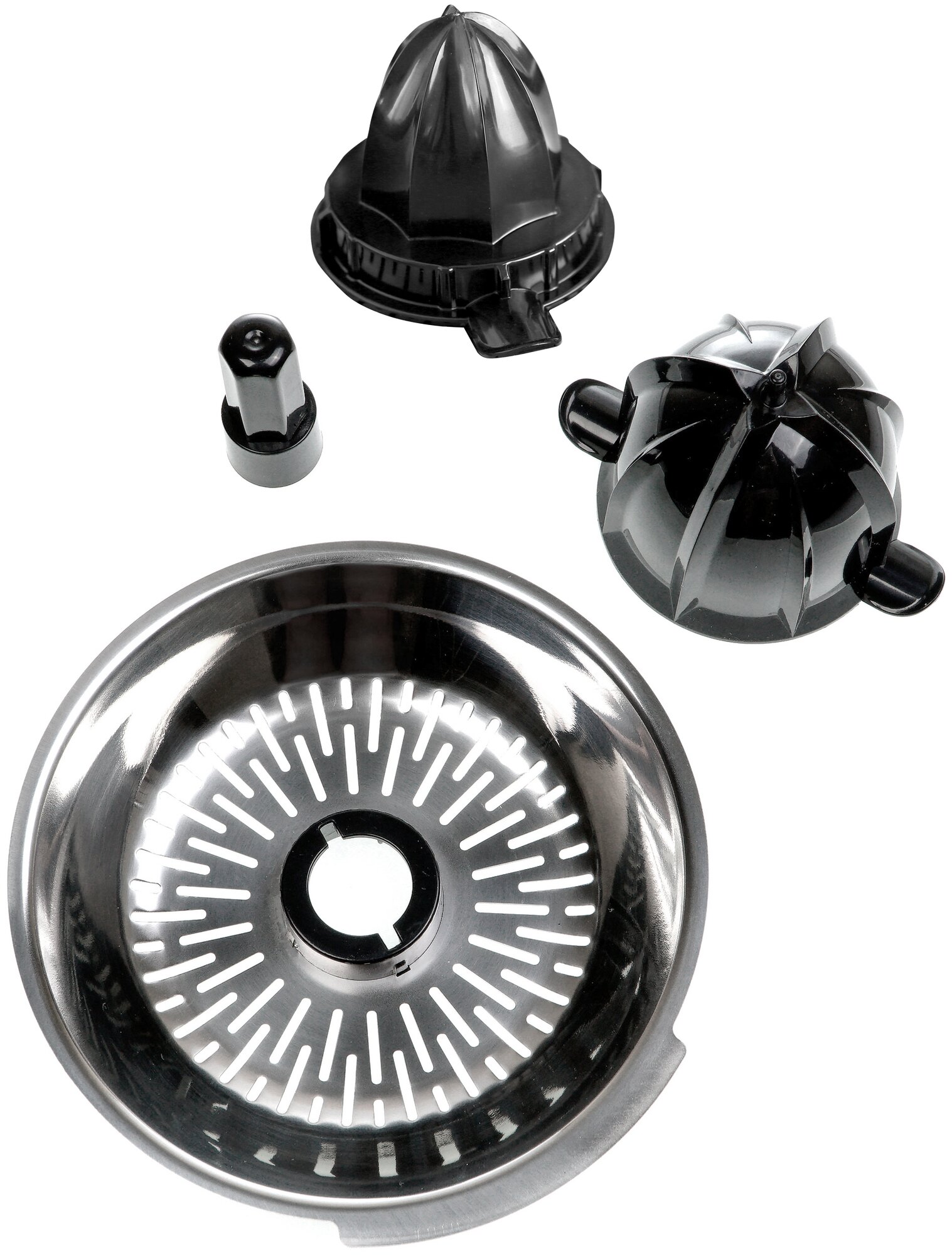 | Комплектация | чаша из прозрачного пластика с указанием максимального уровня сока при отжиме, фильтр из нержавеющей стали для косточек и мякоти, 2 съемных конуса из черной пластмассы для разных видов цитрусовых |