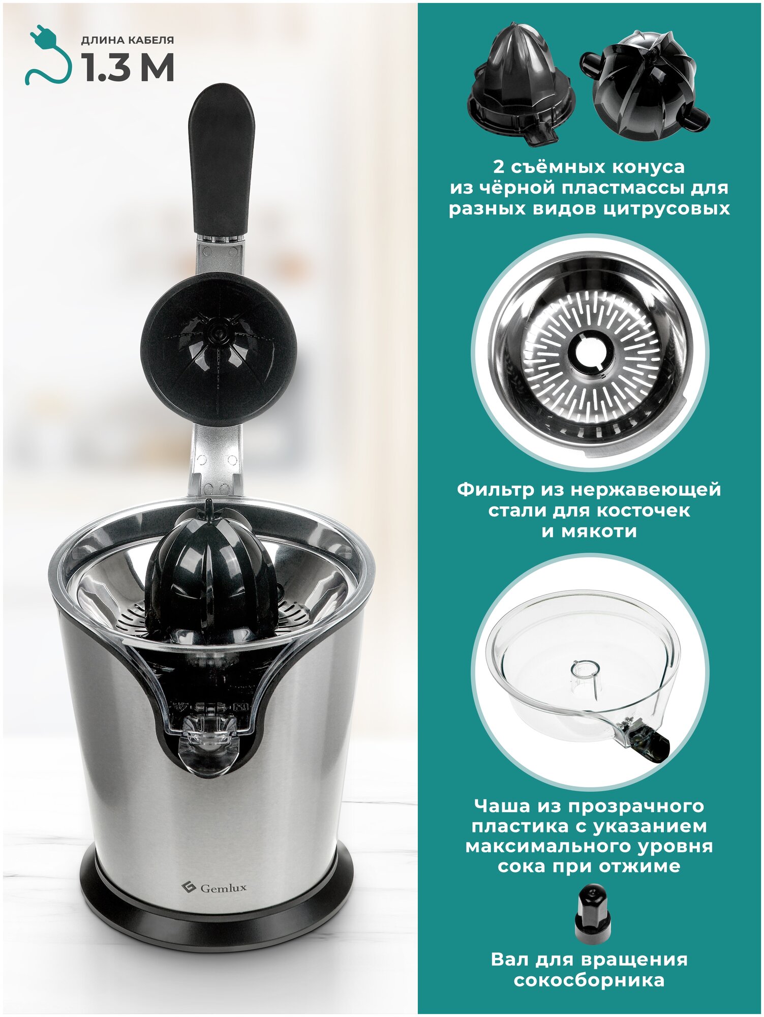 Соковыжималка Gemlux применяется для получения сока апельсинов, лимонов и других цитрусовых. Оснащена металлическим прижимным рычагом и сливным носиком. Фильтр изготовлен из нержавеющей стали. Повторно-кратковременный режим работы. Присутствует 2 положения высоты носика для работы в режиме отжима и розлива сока.