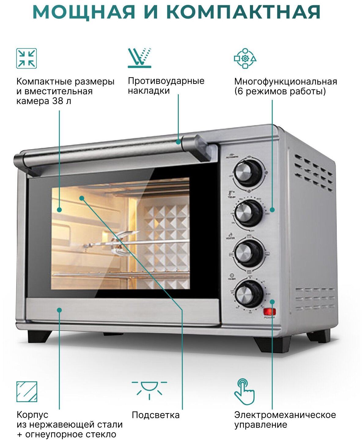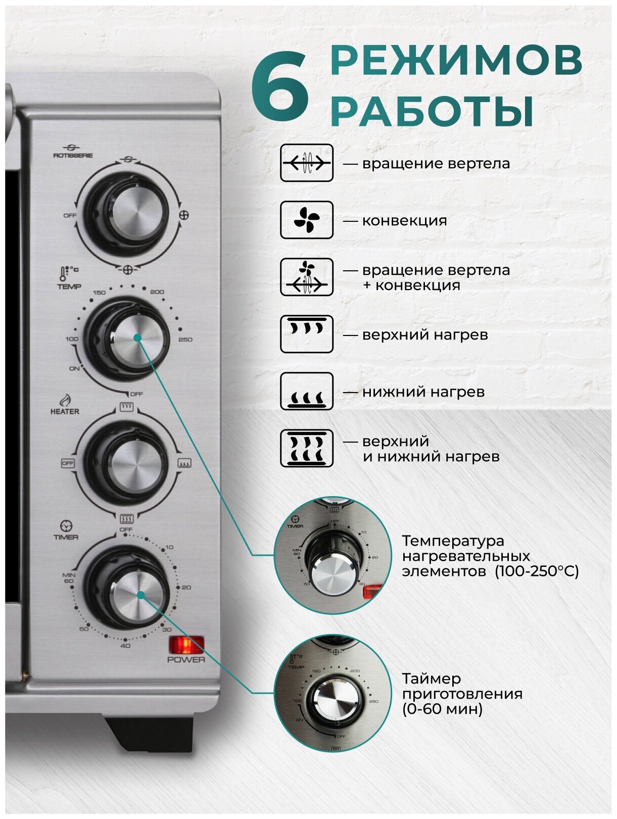 | Режимы | верхний гриль, верхний нагрев, нижний нагрев, конвекция, верхний+нижний нагрев |