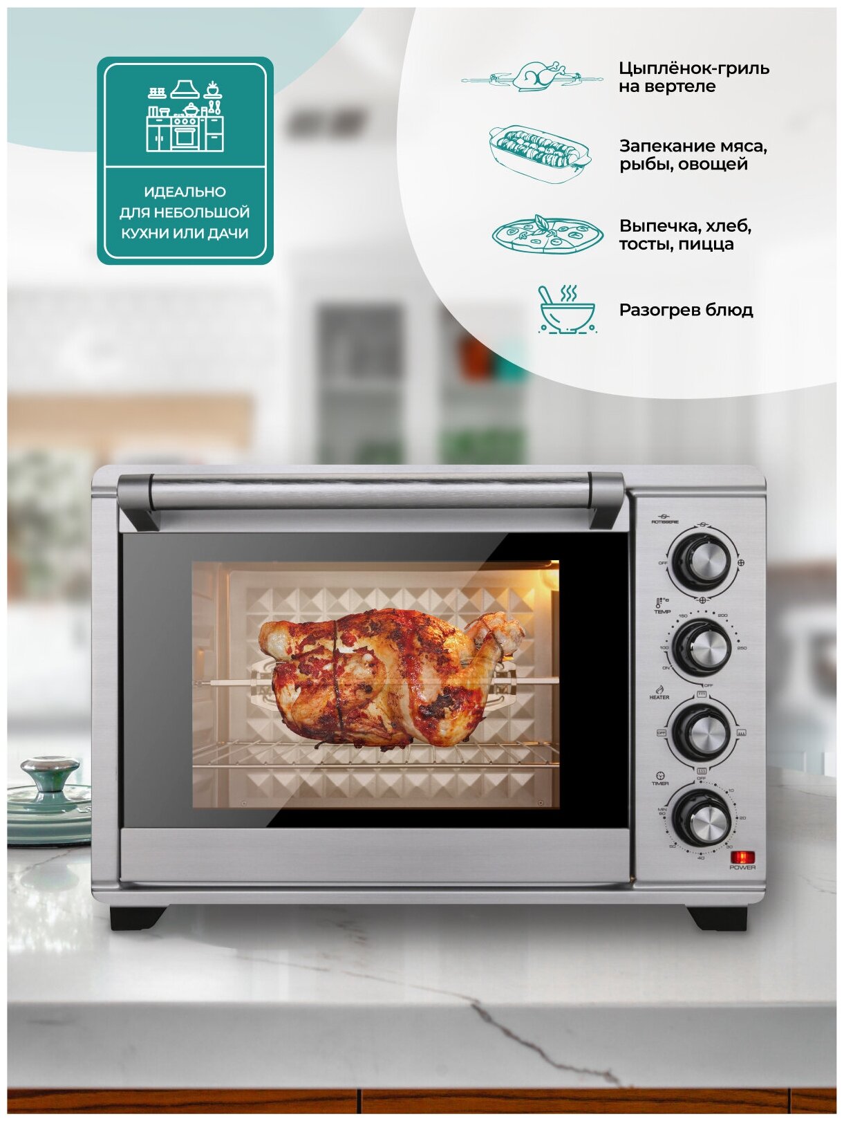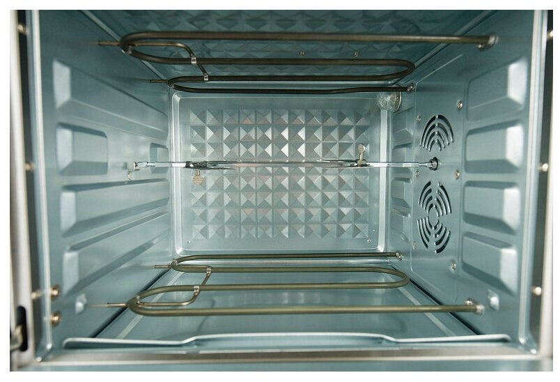 | Камера печи достаточно вместительна | вы сможете готовить в ней цыпленка-гриль на вертеле целиком, мясо и овощи в форме для запекания, хлеб, пиццу диаметром 30 см и многое другое. Конвекция значительно ускоряет процесс жарки и выпечки и делает его более равномерным, а выдвижной поддон для крошек упрощает очистку. |