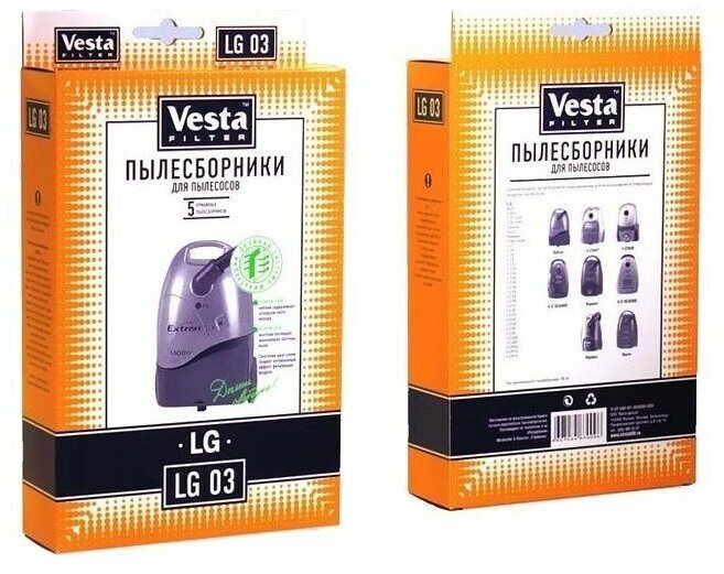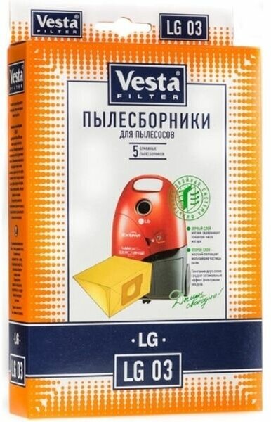 Пылесборники Vesta Filter LG 03 из экологически чистой бумаги для пылесосов LG обеспечивают необходимую защиту вашего пылесоса. Бумажные пылесборники VESTA FILTER LG 03 задерживают более 99 % пыли благодаря двухслойной бумаге. Первый слой мягкий , задерживает основную часть мусора. Второй слой поглощает мельчайшие частицы. Сочетание двух слоёв создает оптимальную систему фильтрации и гарантирует чистый воздух в вашем доме. В комплектацию упаковки входит 5 бумажных пылесборников.