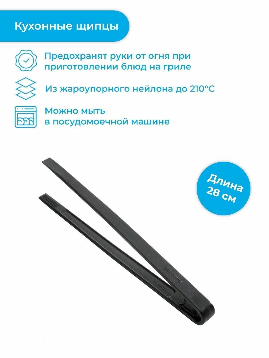 Щипцы-пинцет Tescoma Space Line, выполненные из жароупорного нейлона, легко захватывают и удерживают пищу. Они дают максимальный контроль, одновременно предохраняя ваши руки от огня. Изделие идеально подойдет для жарки мяса. Также щипцы помогут вам аккуратно разложить порции приготовленной пищи по тарелкам. Нейлон не повреждает посуду с антипригарным покрытием и выдерживает температуру до 210°C. Щипцы-пинцет Tescoma Space Line займут достойное место среди аксессуаров на вашей кухне. Можно мыть в посудомоечной машине.