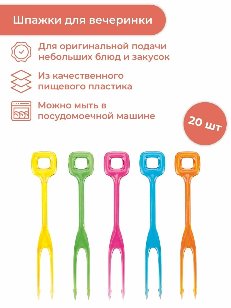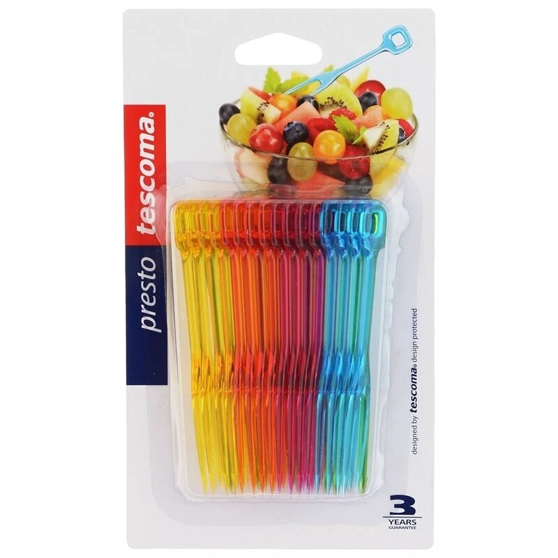 Вилки для канапе Tescoma PRESTO идеально подходят для оригинальной подачи небольших блюд и закусок на семейных, дружеских и корпоративных праздниках и вечеринках. -Вилки для вечеринок имеют достаточно большой хват и хорошо держат закуску. -Они поставляются в сочетании 5 цветов: зеленый, фиолетовый, синий, оранжевый и розовый. -Вилки для канапе PRESTO легко мыть под проточной водой или в посудомоечной машине, они рассчитаны на многократное использование.-Материал: первоклассный прочный пластик.-Уход: можно мыть в посудомоечной машине.-Гарантия: 3 года гарантии.