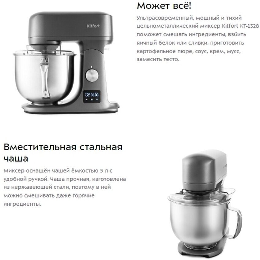 Приобрела миксер KITFORT KT-1328 и до сих пор одно восхищение,минусов не нашла до сих пор,замешивает тесто на ура,большая чаша на 5 л и еще с ручкой,мощность 1200 то что нужно,сам весь металлический(сейчас за такую цену большая редкость),управление плавное очень нравится, Торты мое хобби и миксер очень мне помогает,я в день бывают пеку и по 4 торта . Тесто делает на ура добавляю продукты ,нажимаю кнопочку и пока он делает тесто,я занимаюсь своими делами. Всем советую планитарный миксер ,не пожалете.