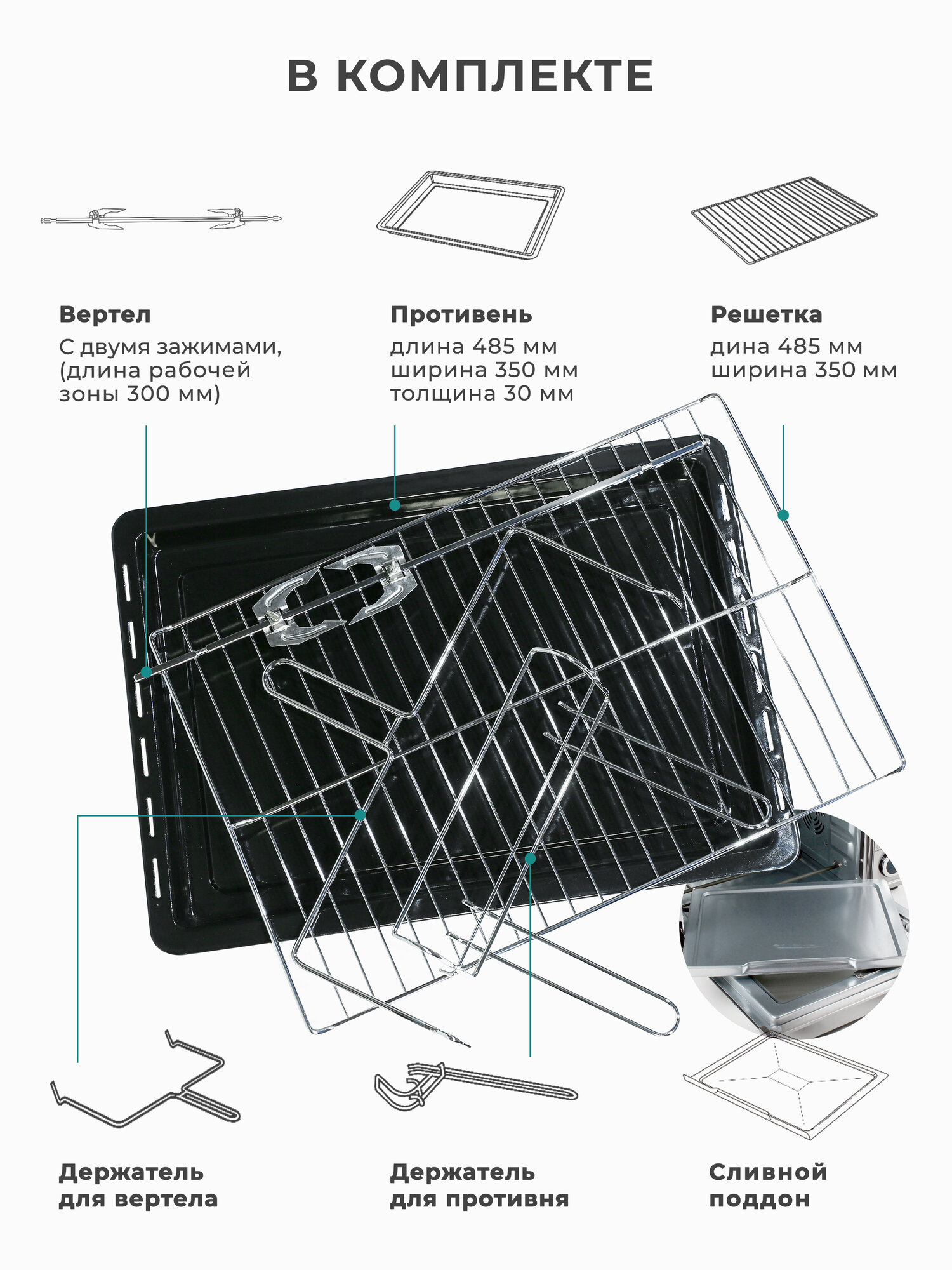 | Комплектация | держатель для противня/решётки, вертел, противень, решётка, поддон для сбора крошек |