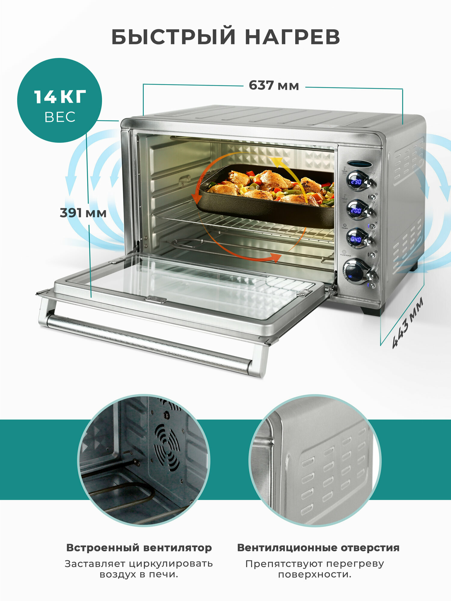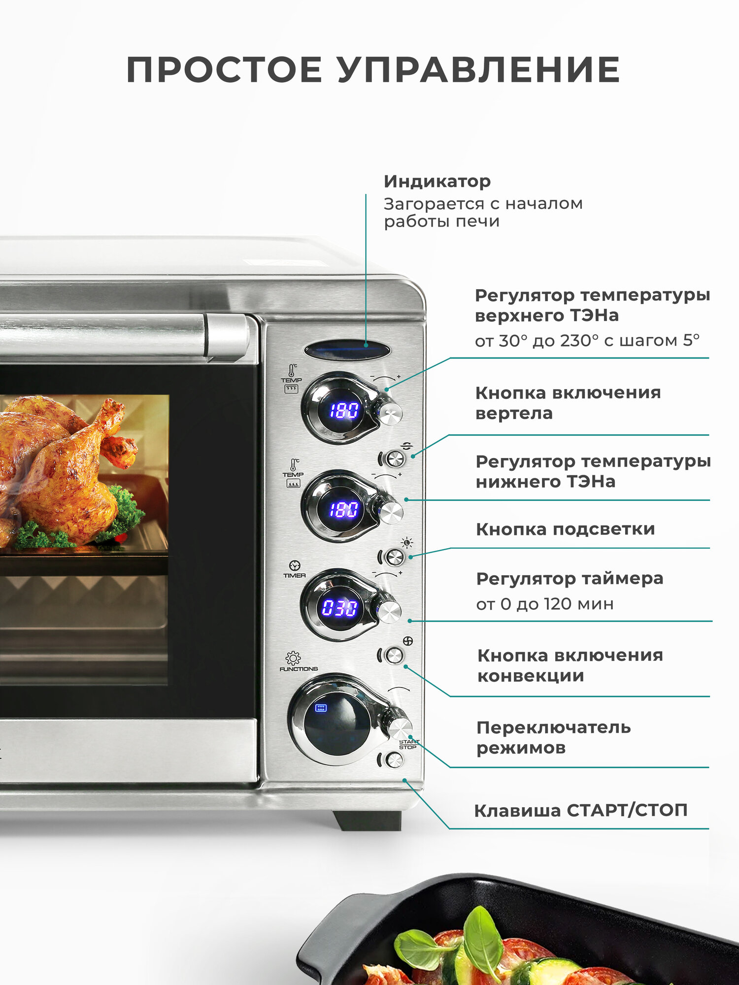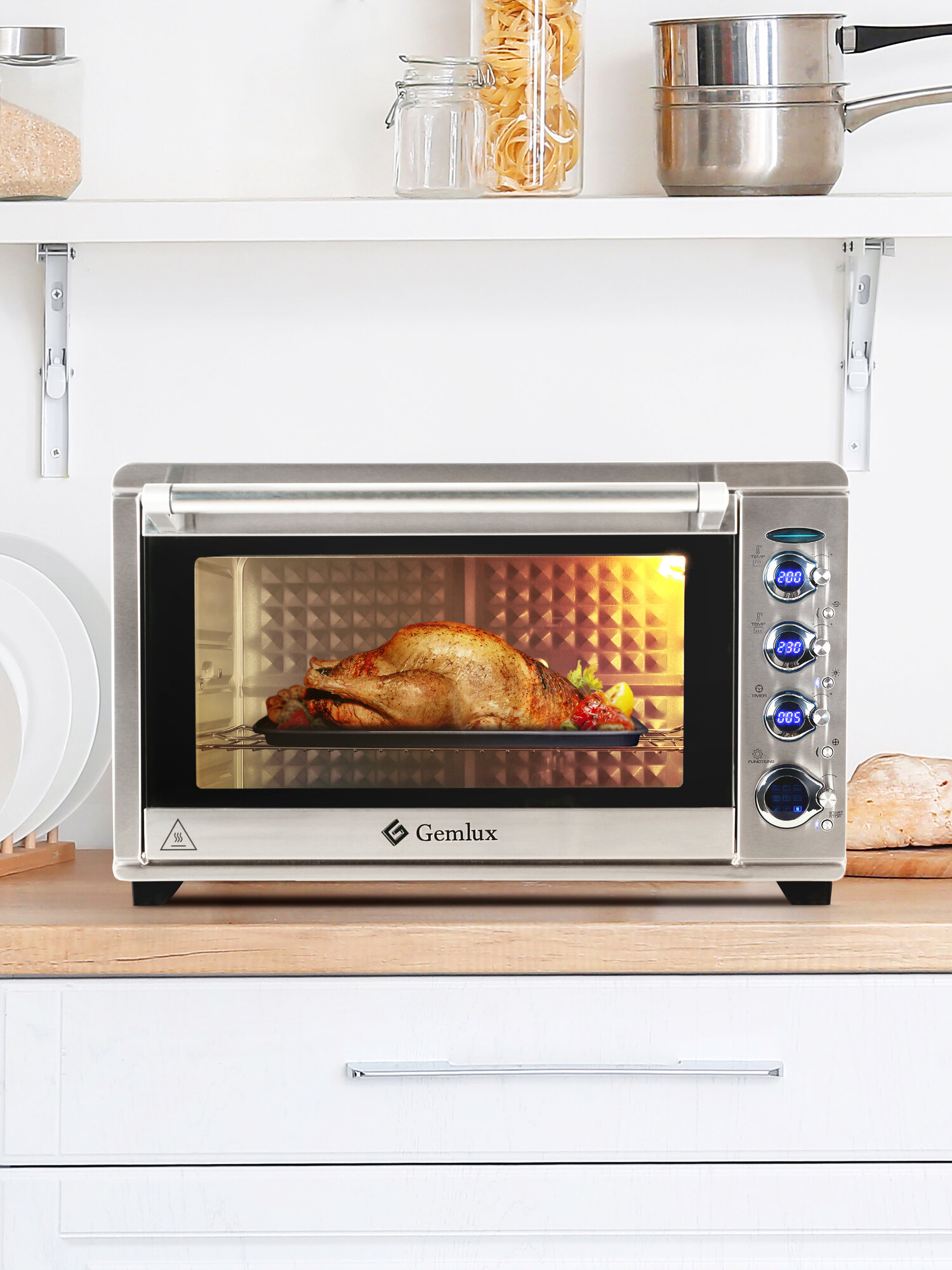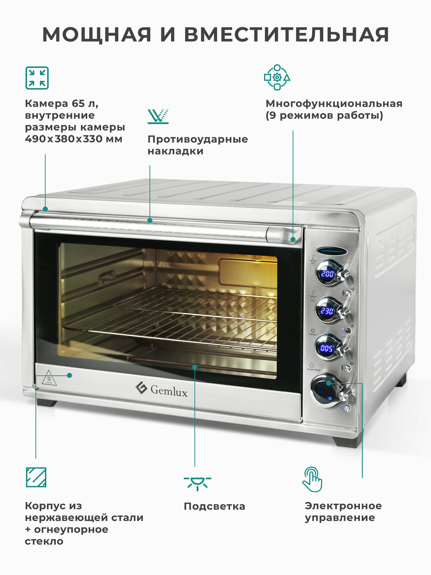 Конвекционная мини-печь Gemlux предназначена для запекания мяса и овощей, выпечки хлеба и пиццы. Модель оснащена роторным грилем, независимой регулировкой температуры верхнего и нижнего ТЭНов, таймером (120 мин.) и подсветкой. Корпус выполнен из нержавеющей стали, дверца - из огнеупорного стекла. 4 ассиметричных ручки управления с ЖК-дисплеями, на которых отображаются текущие значения: режим работы, температура верхнего и нижнего нагревательного элемента и время приготовления. 9 режимов работы: верхний и нижний нагрев, нижний нагрев, верхний нагрев, ферментация, размораживание, запекание цыпленка, приготовление пиццы, приготовление тостов, пользовательский режим: сохранение в памяти заданных настроек. Внутренний размер камеры: 490х380х330 мм. Размеры противня: 485х350х30 мм.