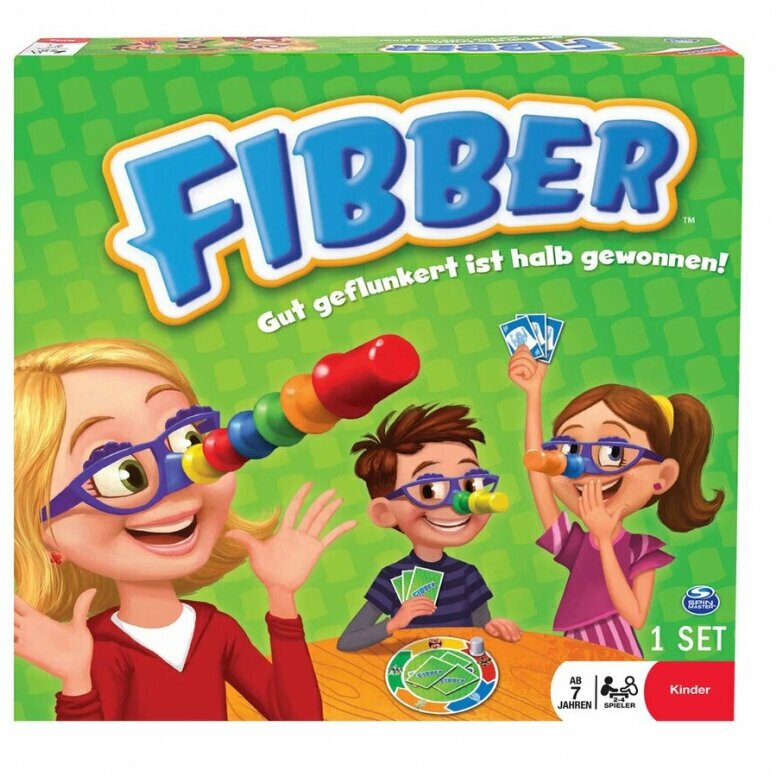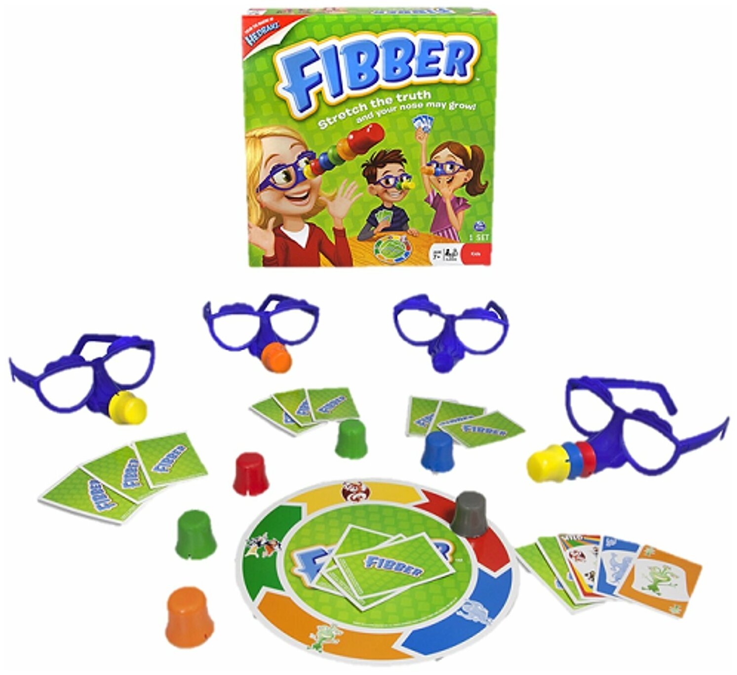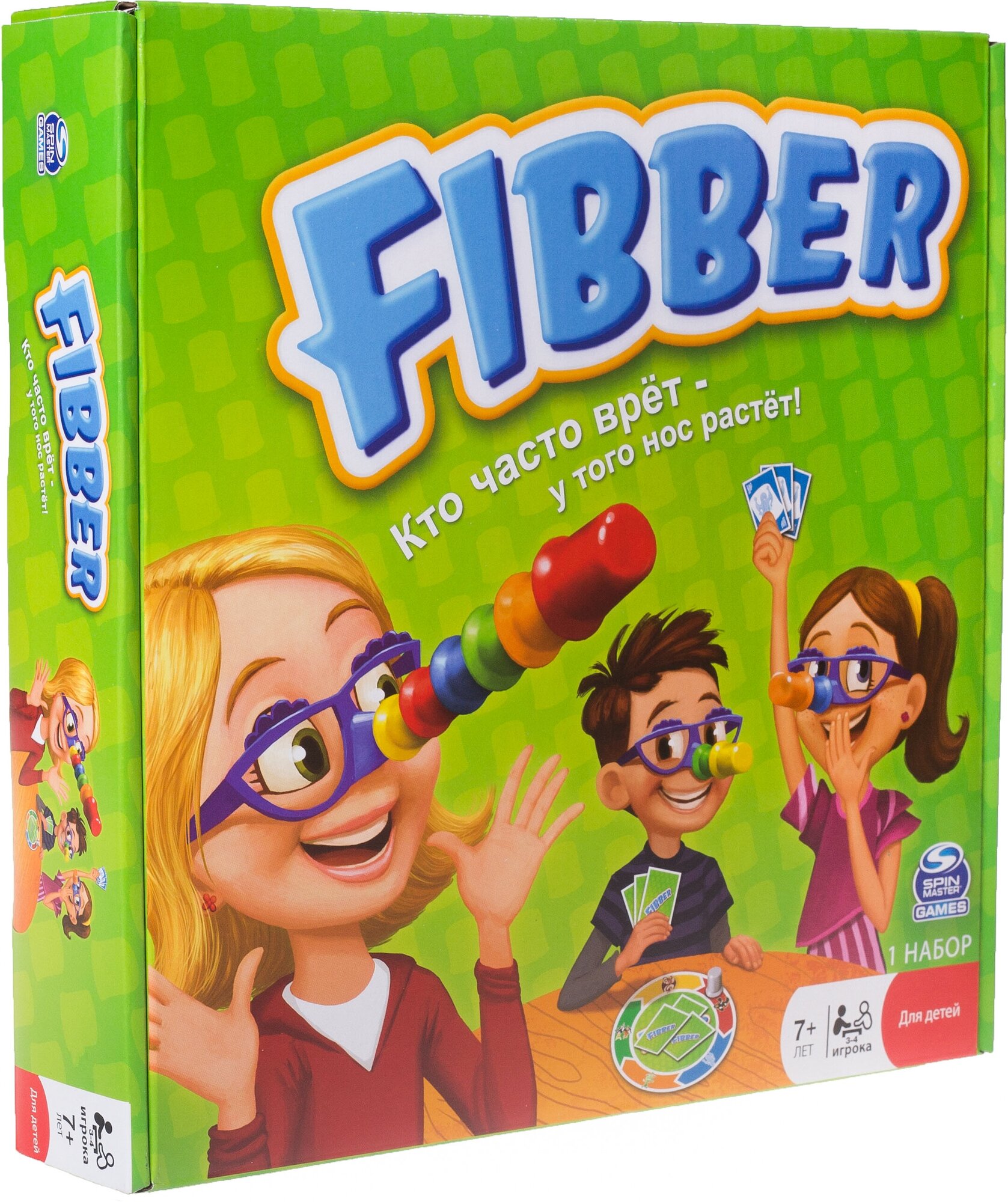 Игра Spin Master настольная FIBBER Наверное, все помнят сказку про Пиноккио. Чем больше мальчик врал, тем длиннее становился его нос. Именно на этом и построена суть этой настольной игры. В переводе она означает "хитрец" или "врунишка". Всем участникам раздаются карты поровну. Так же, для того, чтобы начать игру каждый участник должен будет одеть на себя смешные очки с насадками для накладных фишек-носов. На игровом поле нарисован круг с разными секторами.