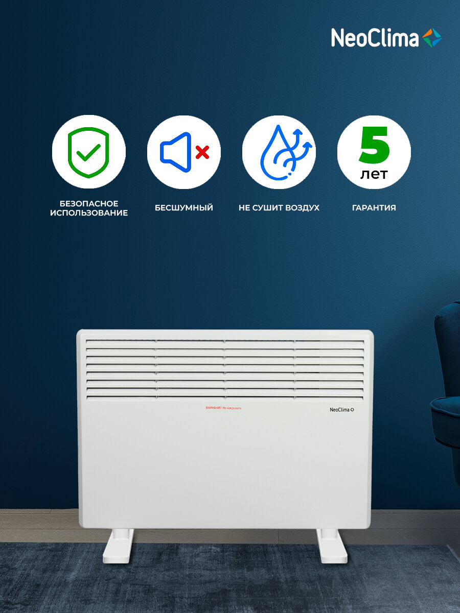 Neoclima (Неоклима) это производительный бытовой конвектор с удобным управлением и тонким передовым дизайном, выполненный в корпусе из качественных материалов. Такое оборудование прекрасно дополнит любой интерьер и будет эффективно служить на протяжении многих лет, качественно обогревая обслуживаемую территорию и не подвергаясь преждевременному износу. Биметаллический термостат.