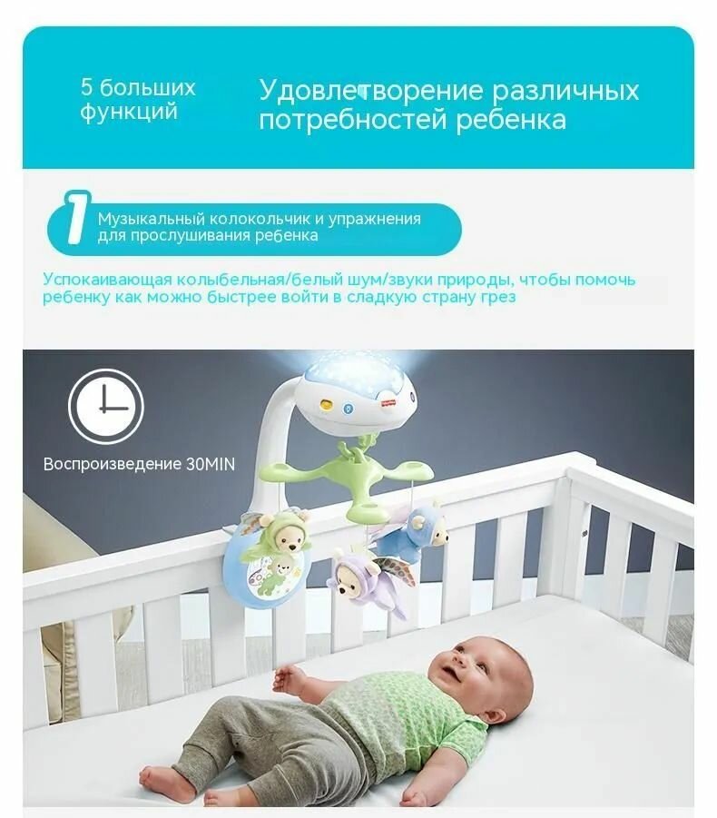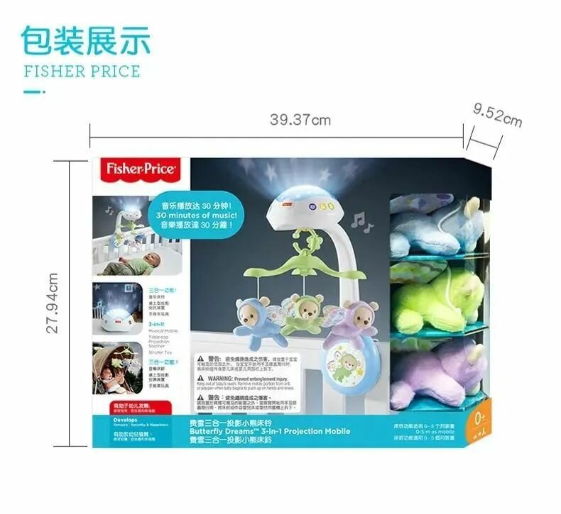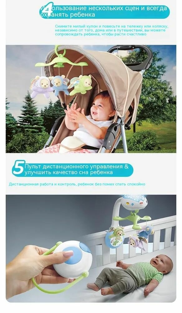 Мобиль модели Мечты о бабочках CDN41 от знаменитого производителя детских игрушек Fisher-Price представляет собой незаменимый прибор для обеспечения спокойного и крепкого сна вашему самому маленькому члену семьи. Проецируя красивое звездное небо мягким ненавязчивым светом, он отвлекает и успокаивает ребенка, вместе с тем можно включить различные звуки природы и песенки и маленькую крутящуюся карусельку с тремя милыми забавными игрушками.