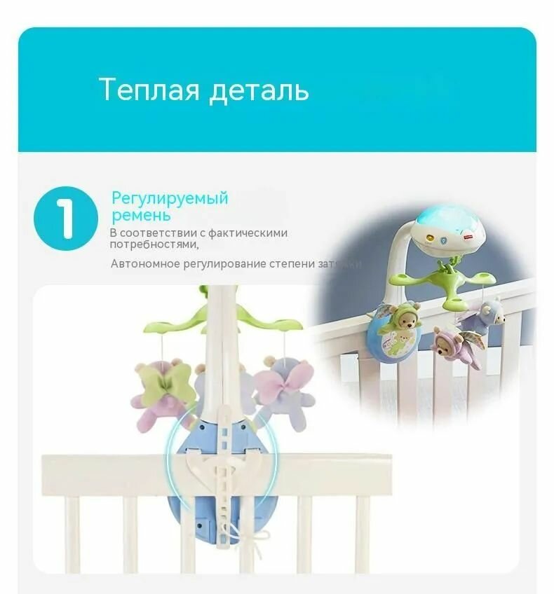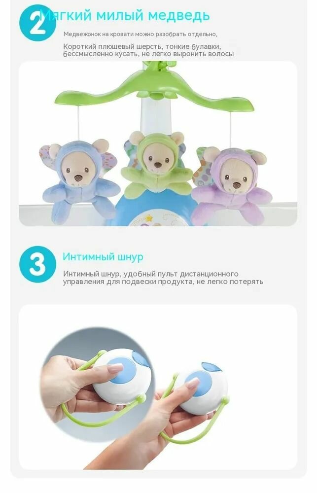 Не дешевый мобиль, но он совершенно обосновано столько стоит. Во-первых, он большой и красивый, во-вторых многофункциональный. В виде ночника вообще незаменимый. Медвежата вращаются в медленном режиме, специально чтобы убаюкать малыша. Музыкальные мелодии - это колыбельные и разные звуки природы. На кроватке закрепляется надежно и прочно.