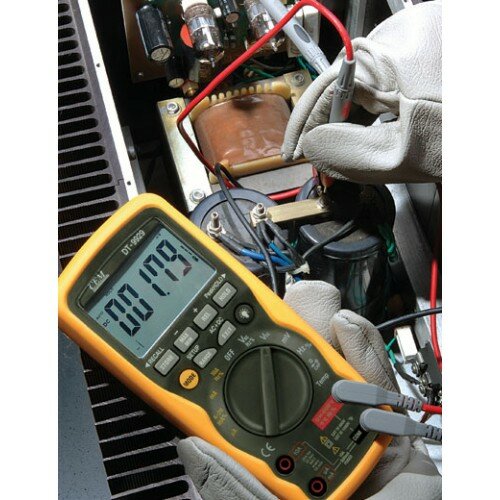 Мультиметр работает при любых погодных условиях, так как имеет влаго- и пыленпроницаемый корпус и широкий диапазон рабочих температур. Независимо от условий максимально точно измеряет токовые параметры электрооборудования и сети при поиске неисправностей и тестировании – напряжение, сопротивление, силу тока, частоту, температуру, прозвон диодов. Кроме того, контрастный ЖК дисплей имеет подсветку при плохой освещенности, выводимые данные в цифровом формате видно четко. Диапазон измерений выбирается прибором автоматически, не исключая точные ручные настройки. Дополнительные возможности обработки данных дает USB интерфейс. Батарейки для автономного питания прибора входят в комплект.