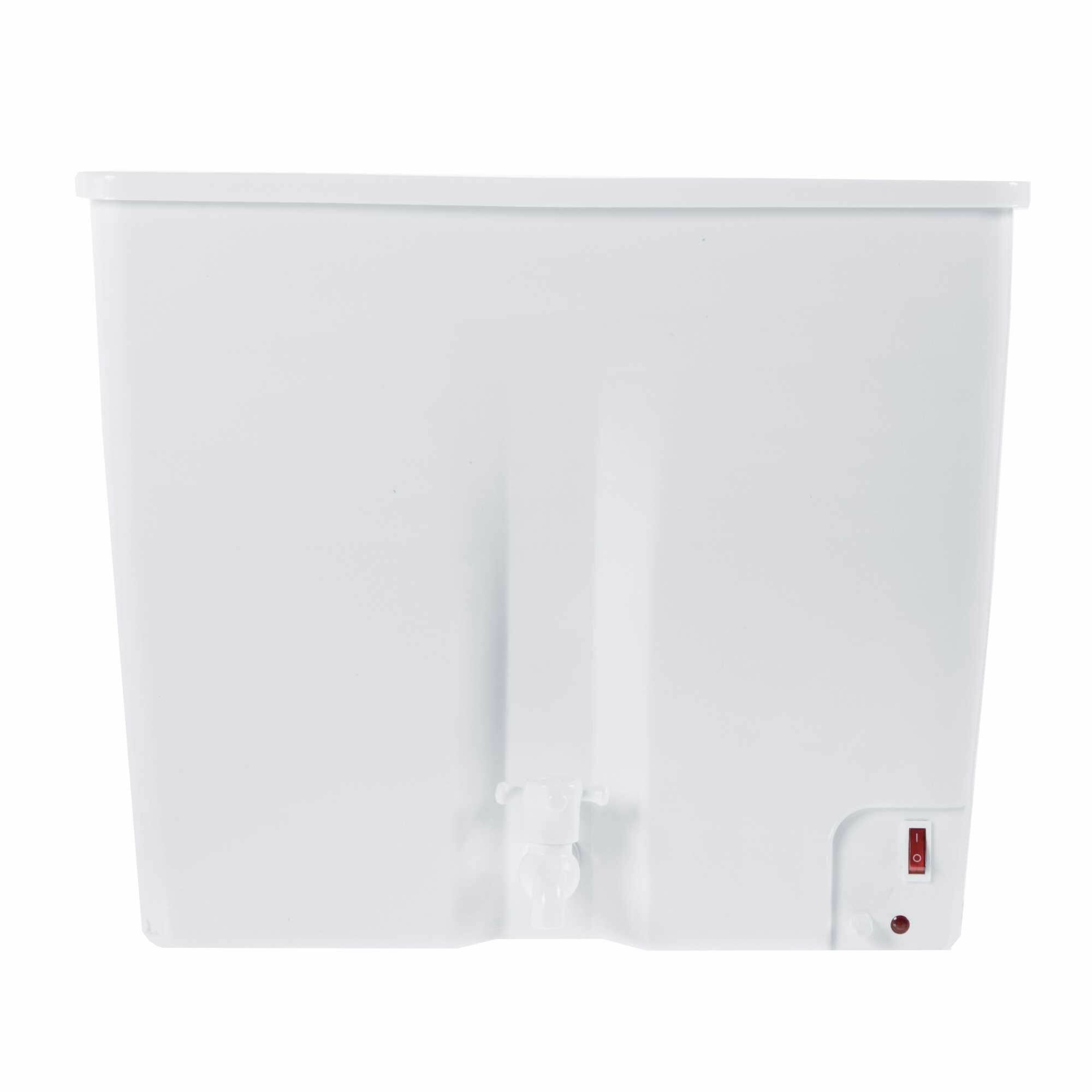 Емкость бака составляет 22 л, за счет чего не нужно долго ждать и часто греть воду. Он выполнен из полипропилена белого цвета, который обеспечивает максимальную гигиеничность и не нуждается в сложном уходе. В конструкции умывальника не предусмотрены тумба и мойка, поэтому модель не занимает много места. Нагрев воды происходит благодаря использованию спирального нагревательного элемента, благодаря которому жидкость быстро и равномерно прогревается. Высота умывальника составляет 40 см, а ширина – 49 см, поэтому умывальником смогут с удобством пользоваться люди разного роста и комплекции.