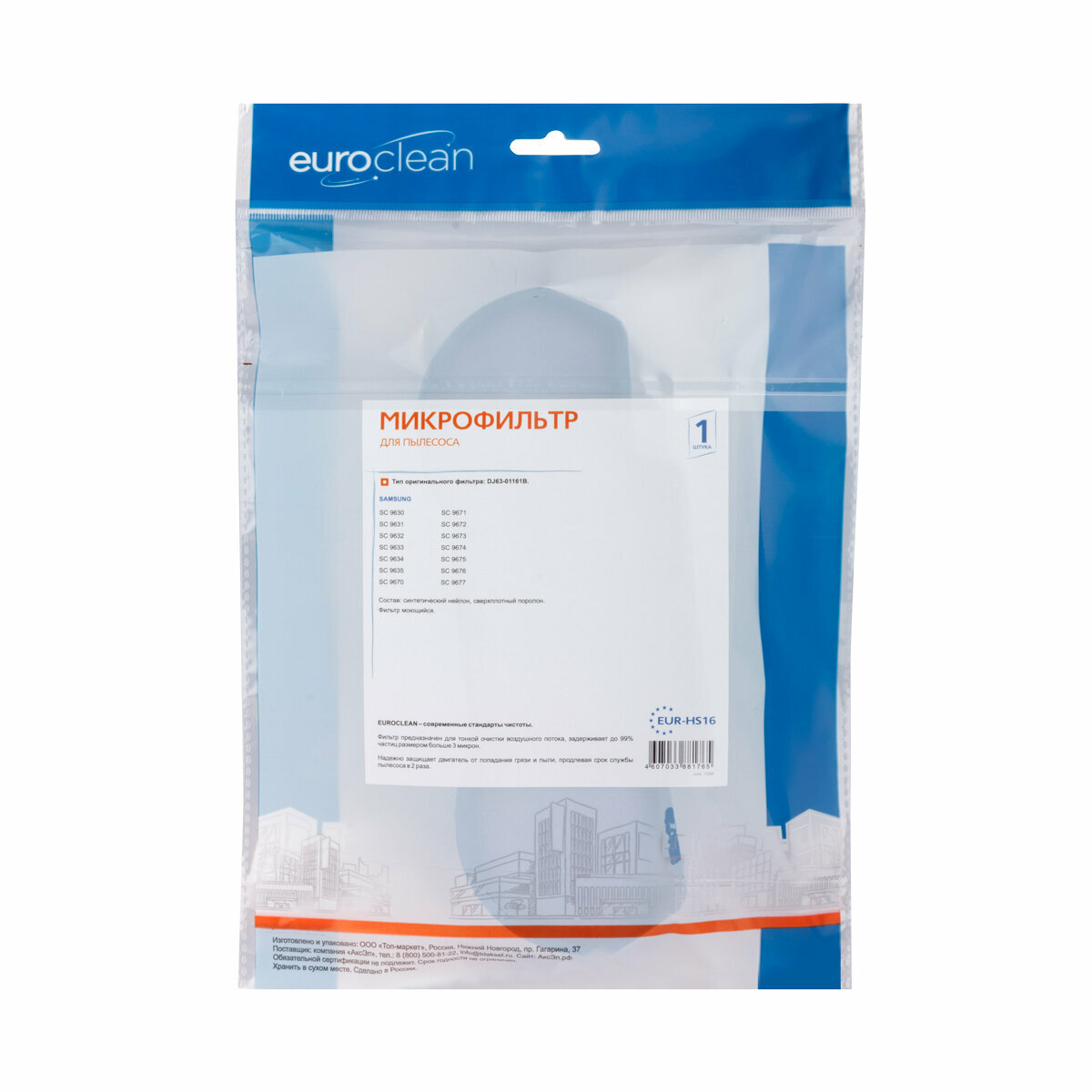 Микрофильтр Euro Clean EUR HS-16 для пылесосов Samsung SC 9630 / SC 9631 / SC9632 / SC 9633 / SC 9634 / SC 9635 / SC 9670 / SC 9671 / SC 9672 / SC 9673 / SC 9674 / SC 9675 / SC 9676 / SC 9677. Фильтр предназначен для тонкой очистки воздушного потока и защиты двигателя. Микрофильтр надежно удерживает мельчайшие частицы пыли благодаря применению специальных фильтровальных материалов. Уникальность микрофильтра Euro Clean EUR HS-16 в сложной рельефной поверхности, за счет которой увеличивается фильтрующая площадь и значительно повышается уровень фильтрации.
